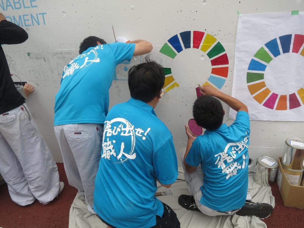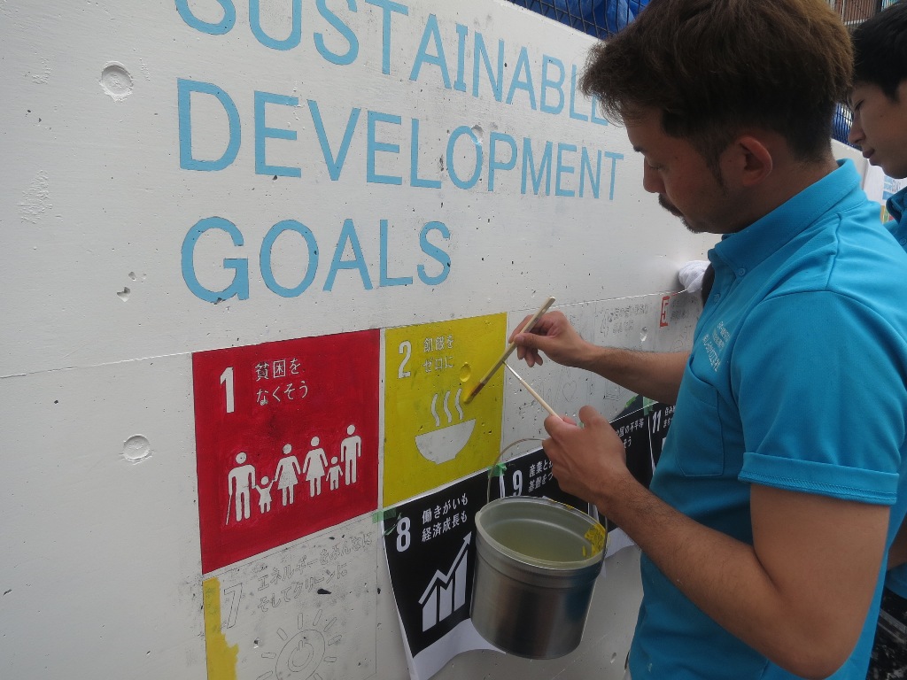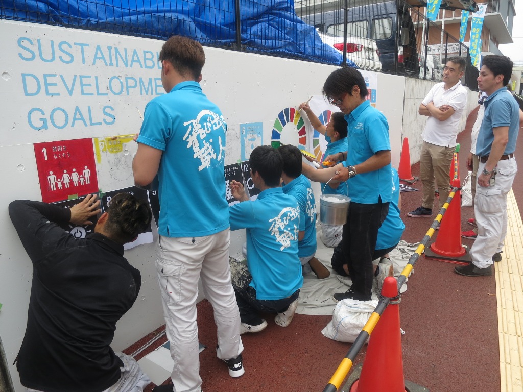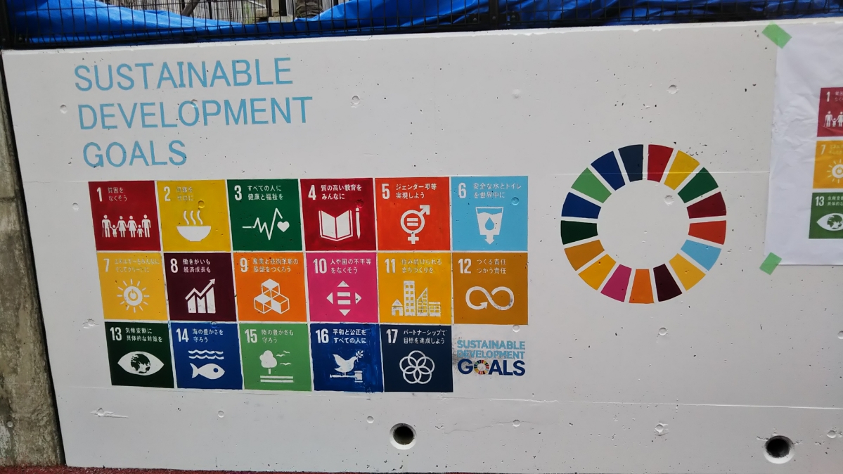 弊社社員の下本の故郷、和歌山県那智勝浦町のお隣りの新宮市役所のコンクリート塀に「SDGs(エスディジーズ)」のシンボルマークを描きました。