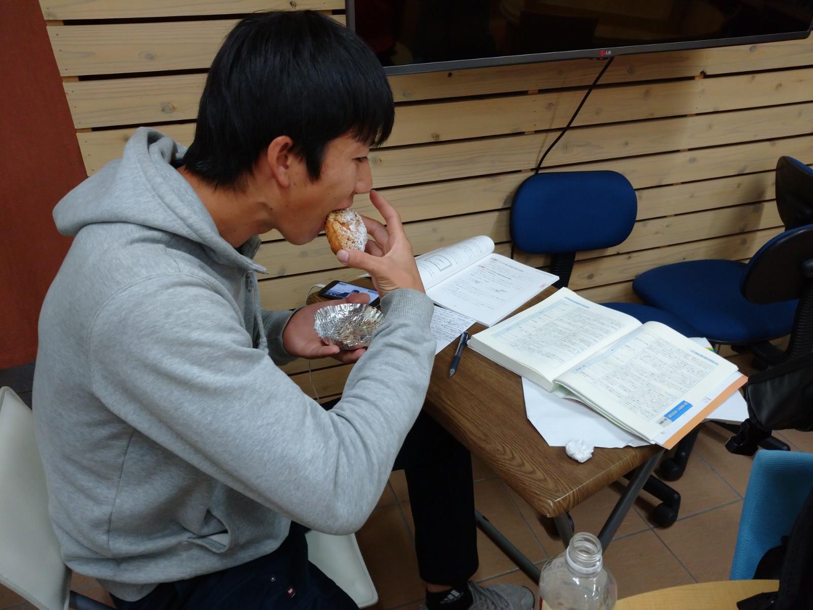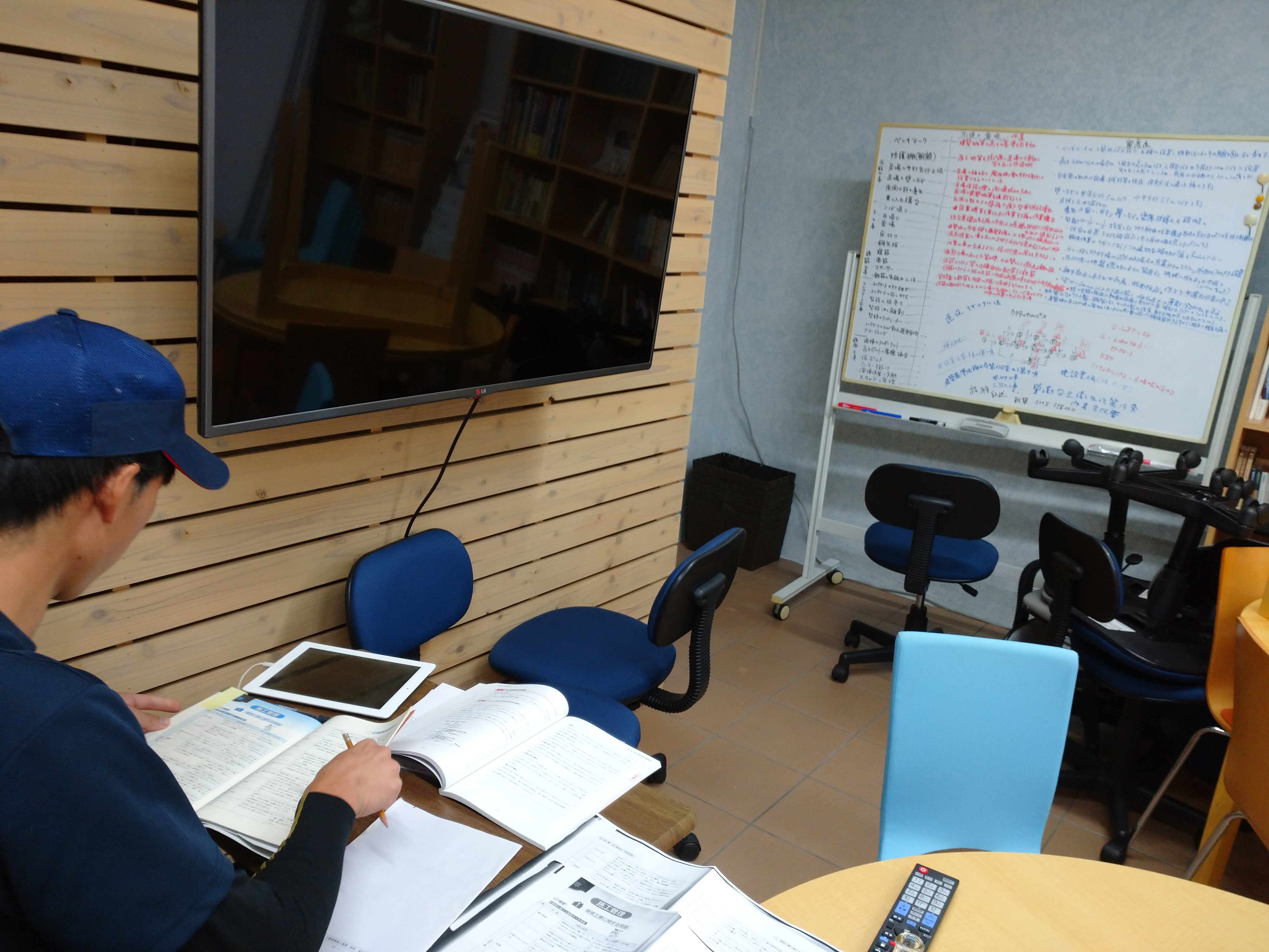 雨が降って塗装作業ができなくなったら、会社のミーティングルームで勉強しています。