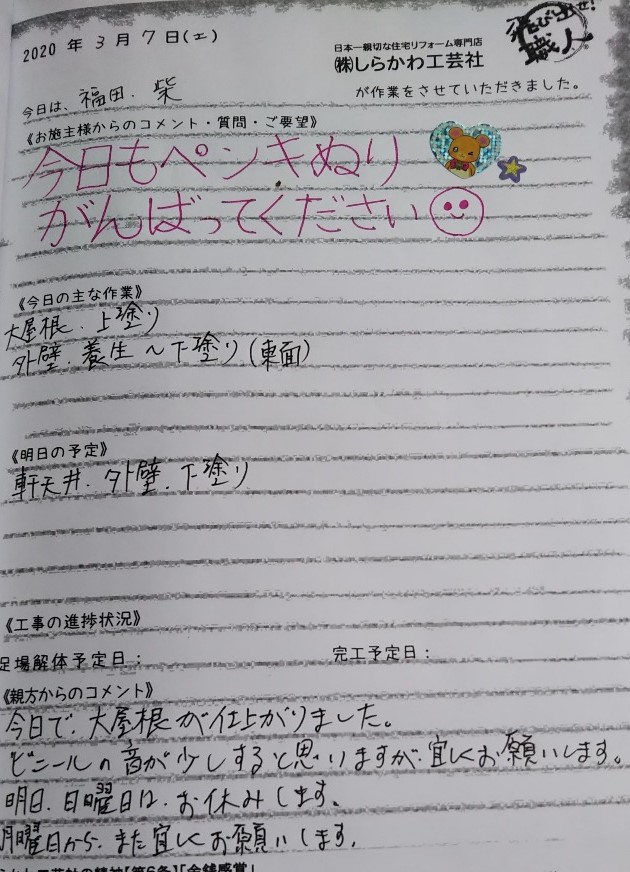 2020/03/10 かわいいコメントに感激! 日常 神戸市西区竹の台H様邸の外壁塗り替えをしています。 その日の作業が終わったときに、作業内容を用紙に書いて報告します。 お客様からのコメント欄もありますが、初めて小学生のお子様からのコメントをいただきました。 かわいくてすごく感激です。