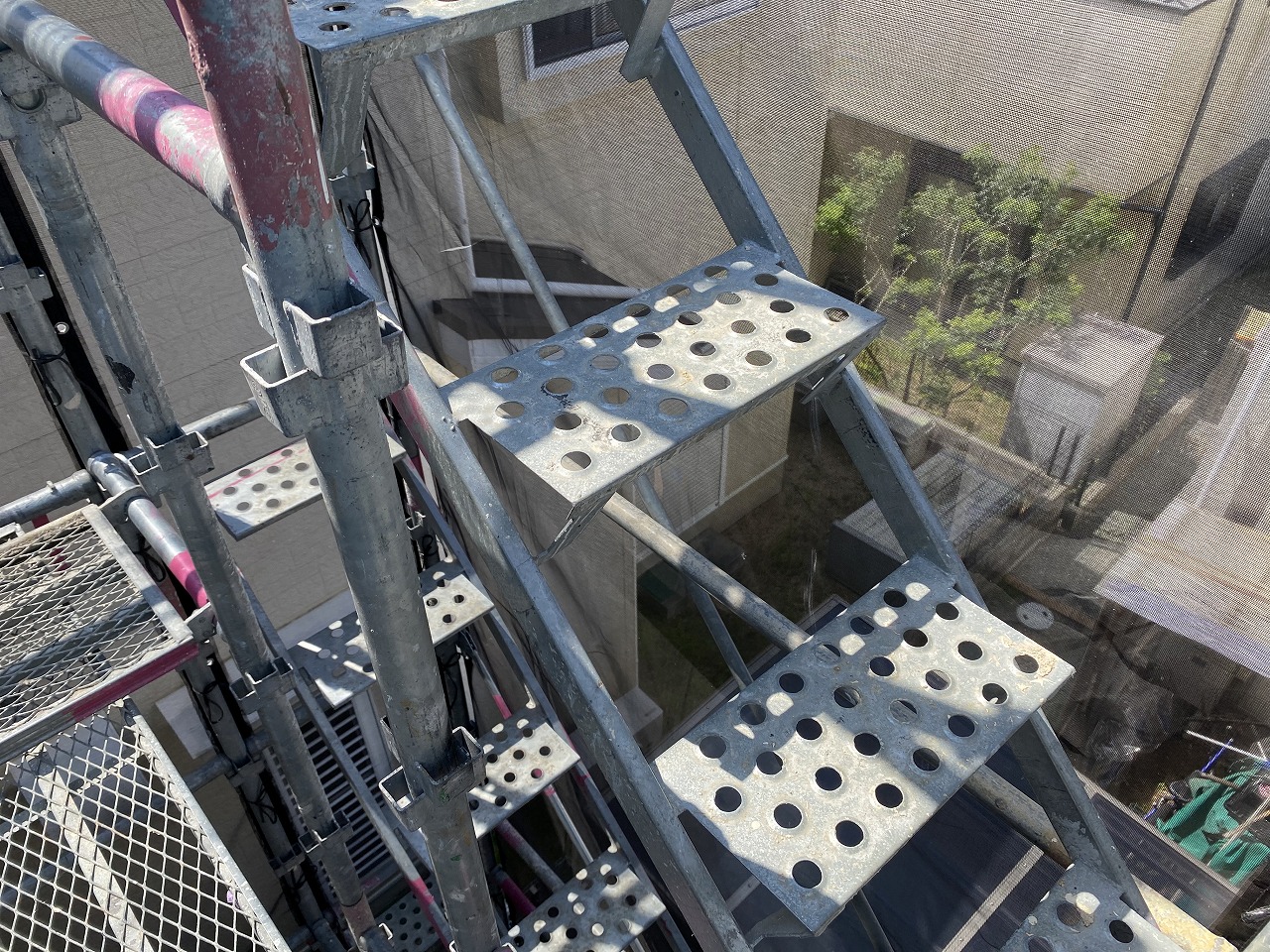 足場登るの大変だと思うと思いますが、階段足場があるので鄭さんは「階段があると楽や」と。