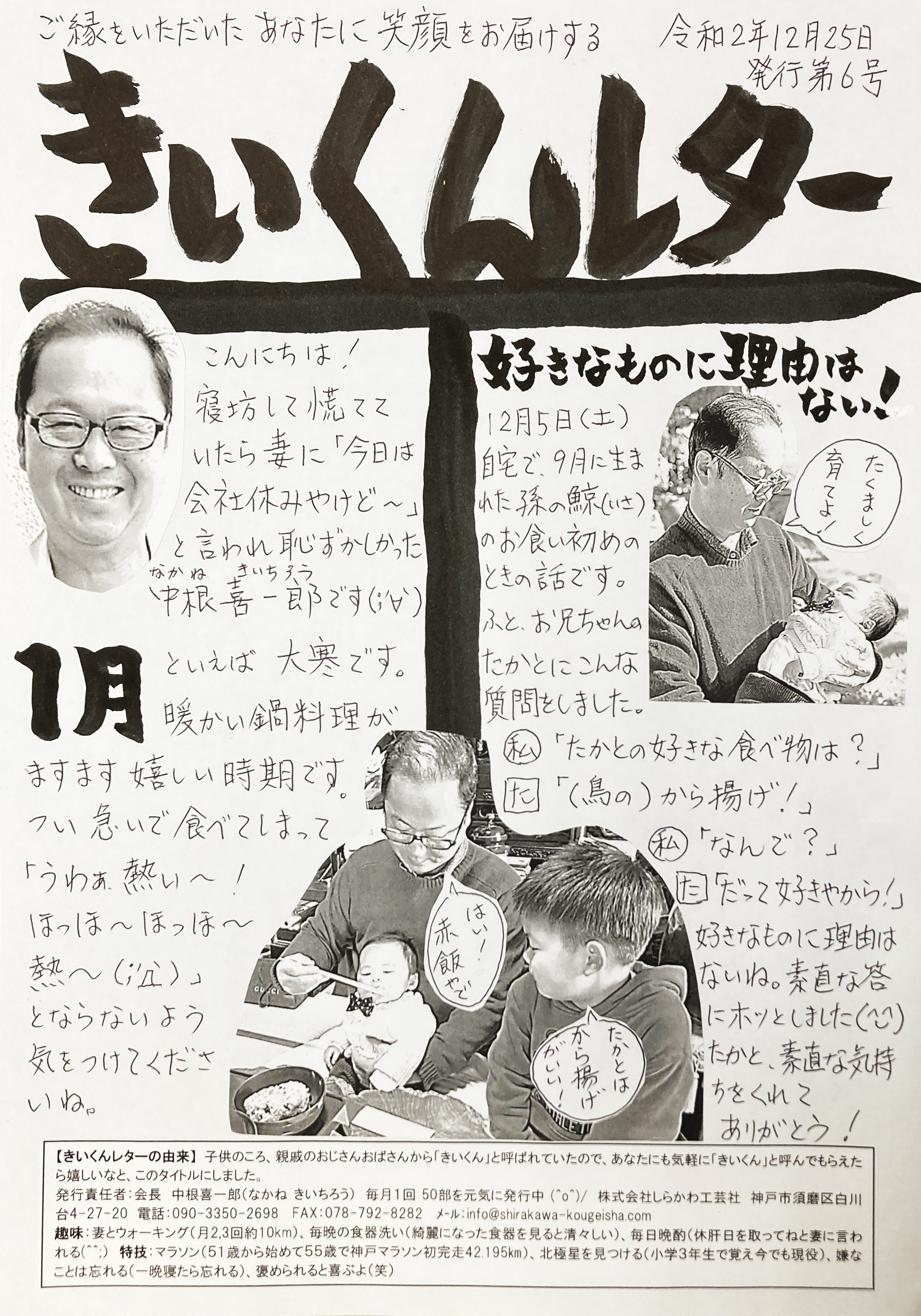そんな寒い時期でも心はあったかく、今月もしらかわ工芸社の会長が手書きのきいくんレターを発行しました!