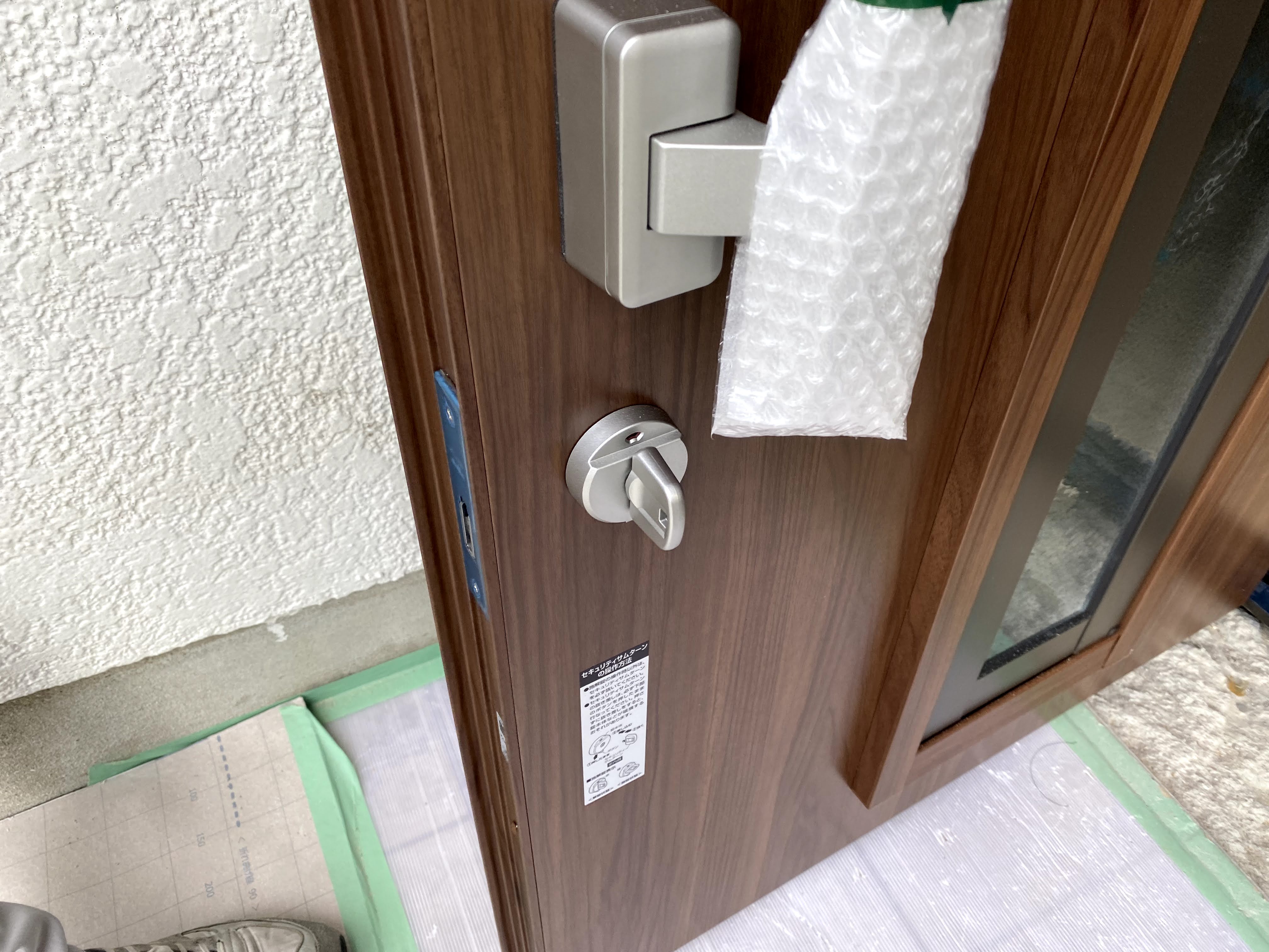 2021/10/12 「玄関ドア交換で防犯対策!?」 塗装以外でもこんなことしています! みなさま防犯対策何かしていますか? 防犯カメラ付ける!砂利を敷く!など様々防犯対策はあります! 先日、玄関ドア取替えに立ち会ってきました♪ そこでなんと!!! 内側のドアを開け閉めするカギ部分(サムターン)が取れちゃったΣ(゚Д゚) これこそが防犯対策だそうです! 泥棒さんが来て、窓を割って内側からカギを開けれないようになってます(なるほど~) カギが無い!泥棒さんもビックリ(笑) 色々防犯対策があるんですね~