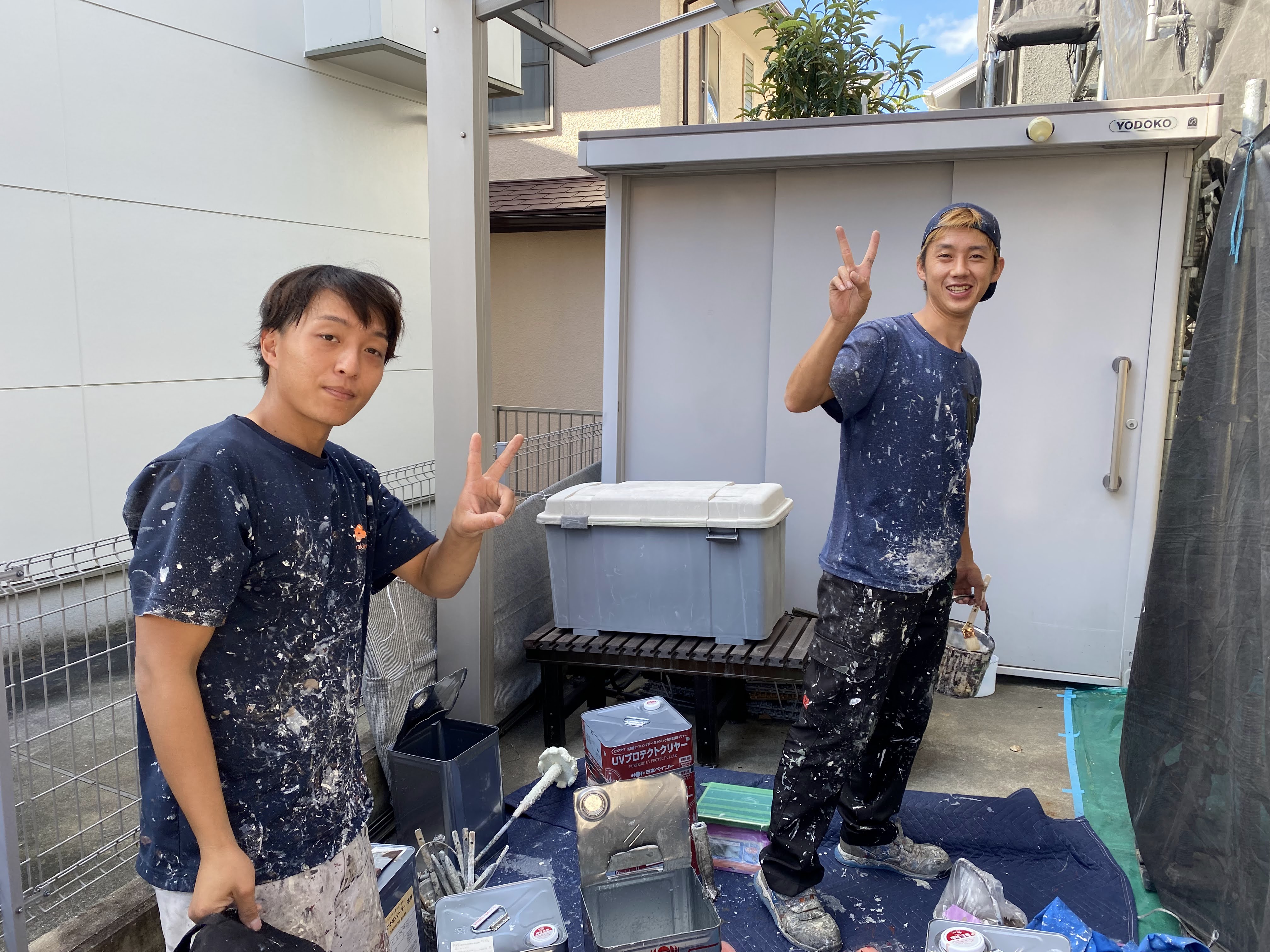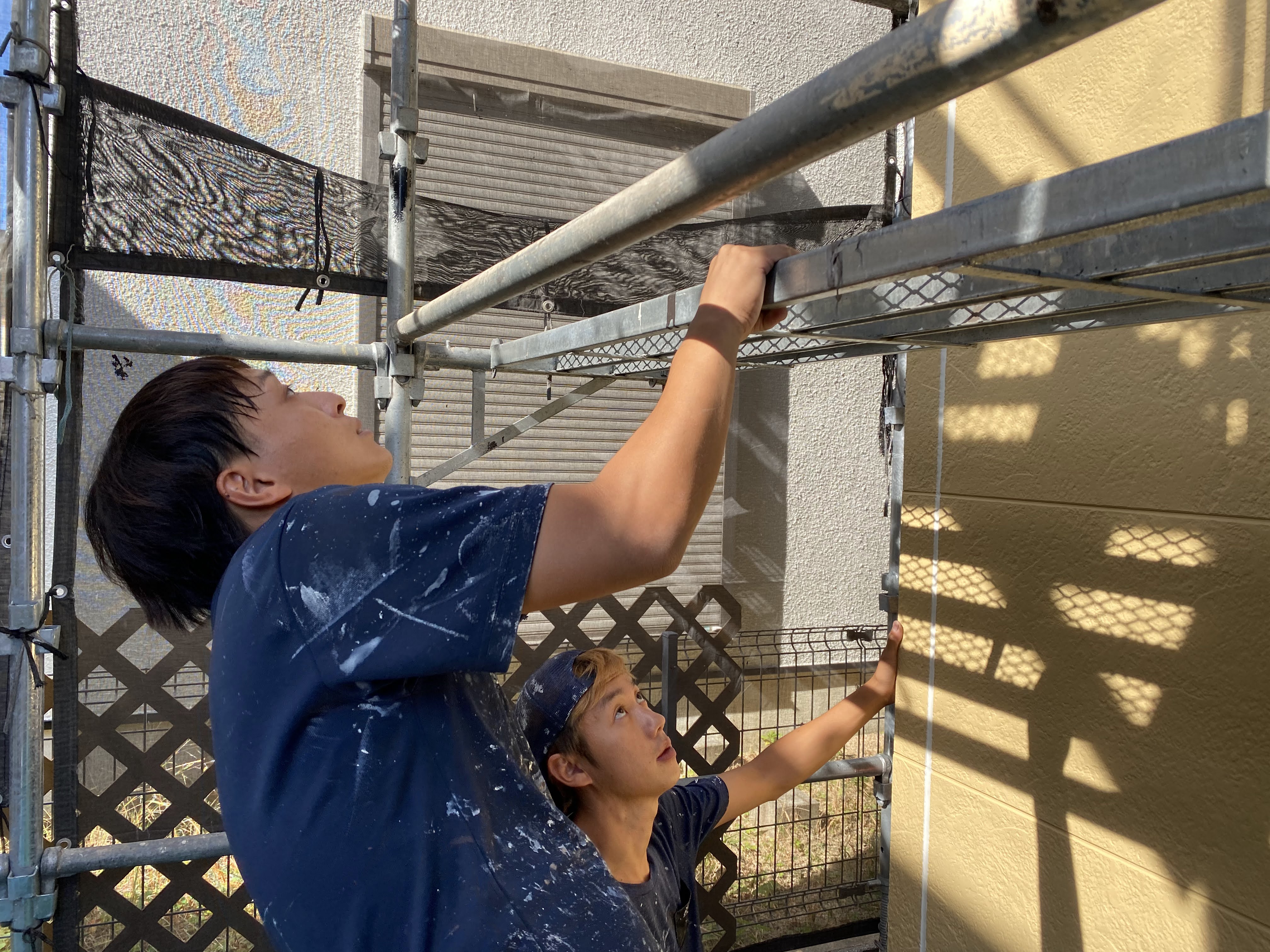 2021/10/15 「フレッシュ2人組!」 社員紹介塗装工事の現場を見てみよう! 今日も、良い天気で塗装日和!!☀ ということで、北区北五葉の現場に行ってきました! 行くと、ちょうど休憩中! でも休憩しながら、仕事の打ち合わせをしていました♪ 現場責任者の時本さんが太田さんに説明中!! この2人は、今年塗装技能士の資格も無事に取得! 太田さんは、2級塗装技能士!👏 時本さんは、1級塗装技能士に!👏 2人とも真剣に仕事に取り組んでいました(^^)/