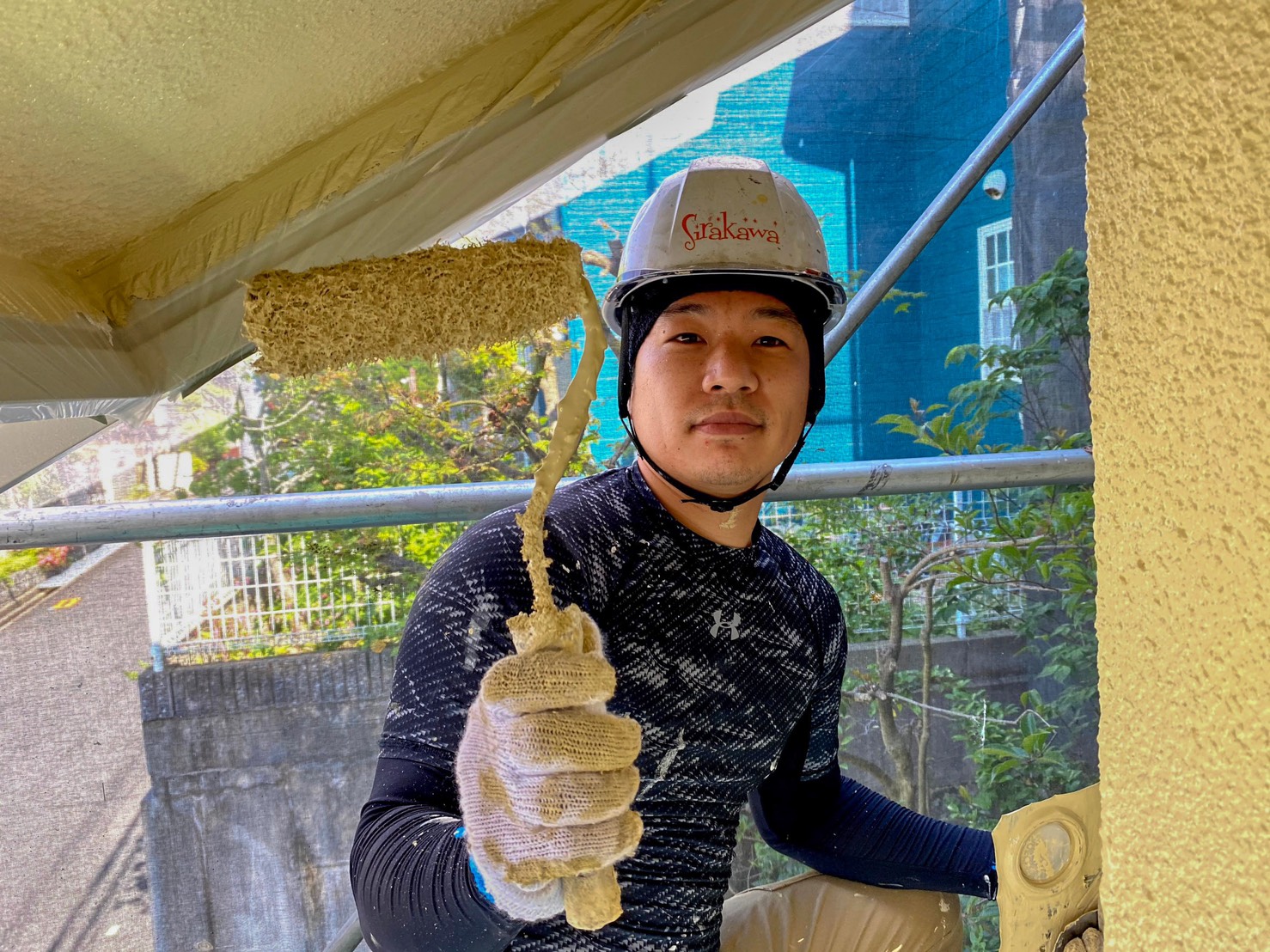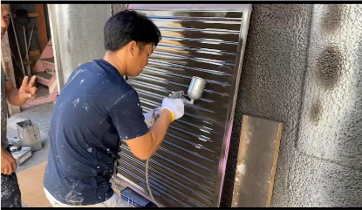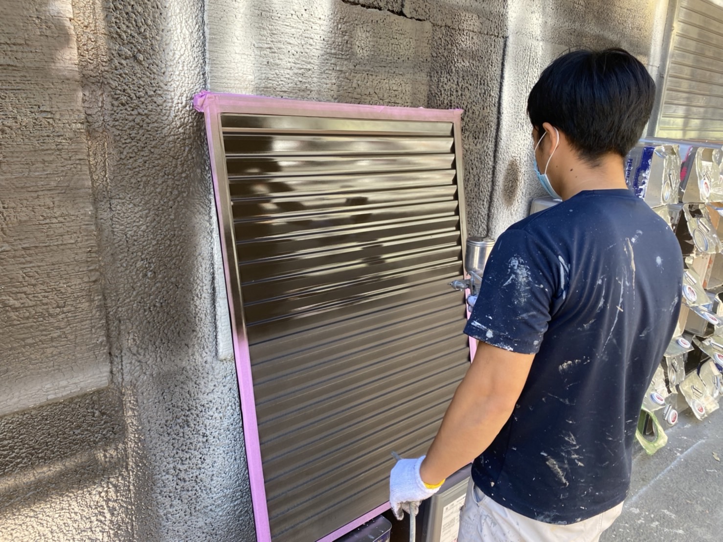 2021/10/19 「初!雨戸吹き付け塗装!?㊗👏」 社員紹介塗装工事の現場を見てみよう! しらかわ工芸社に入ってきて約半年の品治さん! しらかわ来る前は他の塗装屋さんで塗装経験があるみたい♪ 今回は初の吹き付け塗装! 先輩のみんなに見守られながら仕事していました♪♪ 品治さんが真剣に仕事しているのに横で小林さんがピース✌(笑) 真面目は品治さんとおちゃめな小林さんでした(笑)