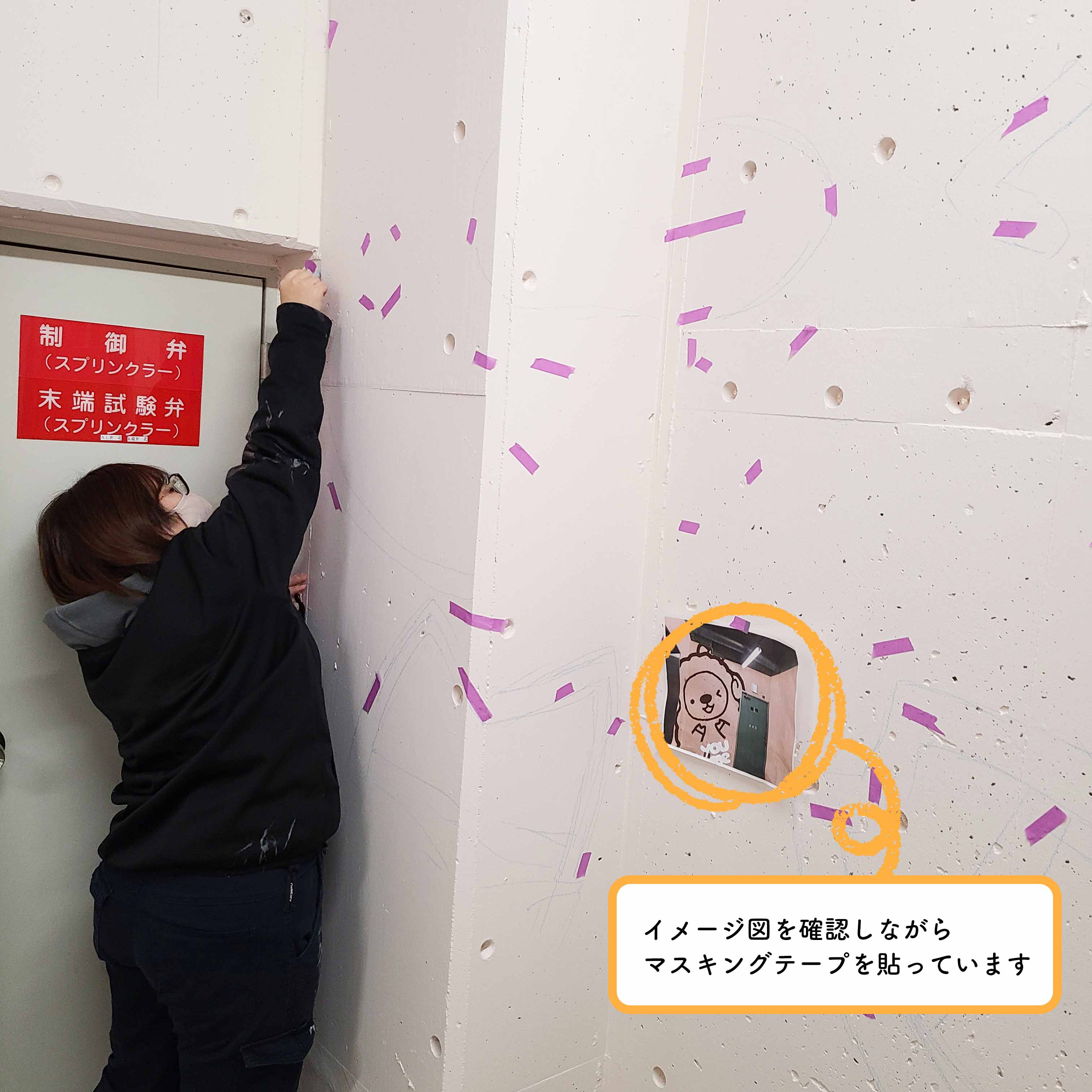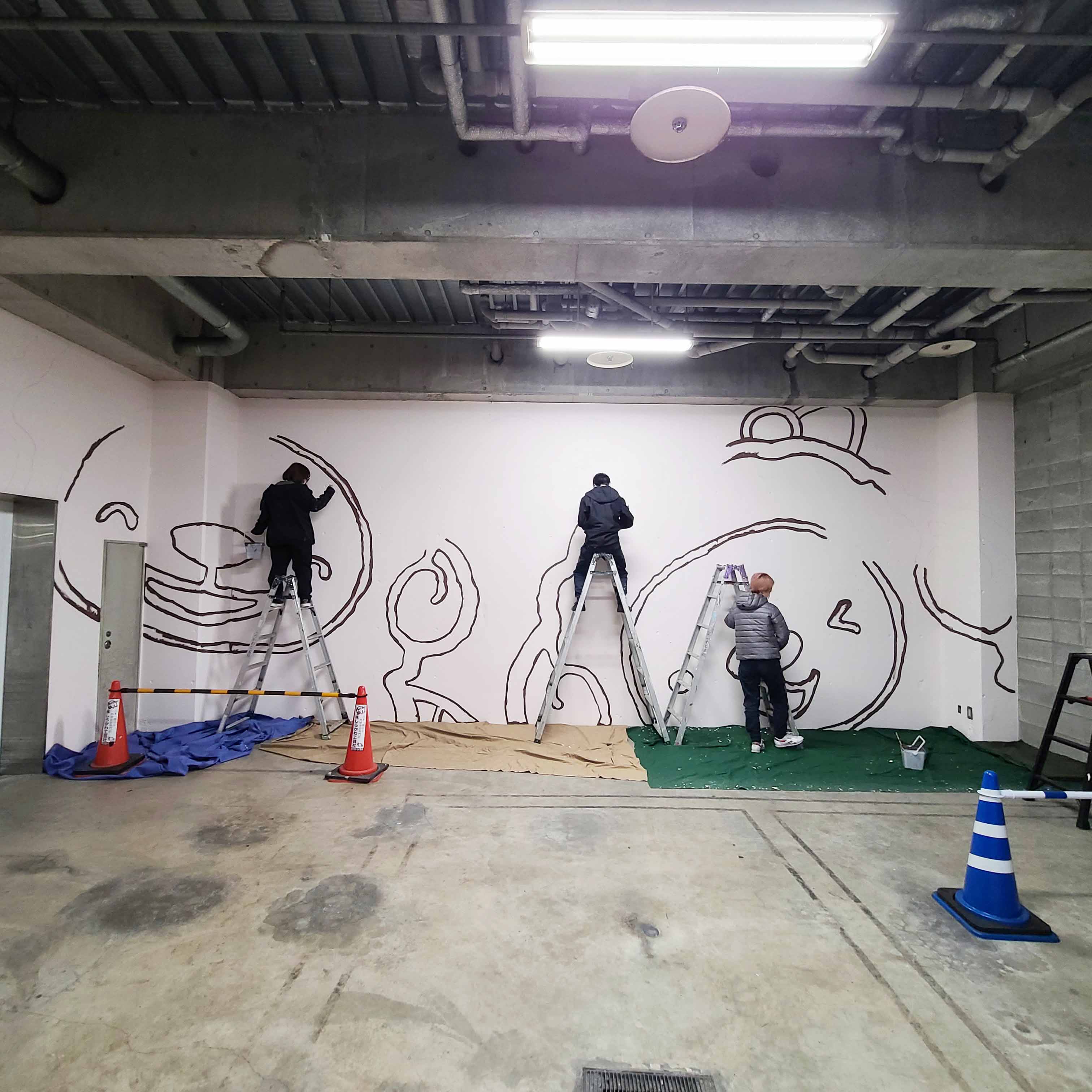 下絵をもとにチョークで壁に直接描いたり、