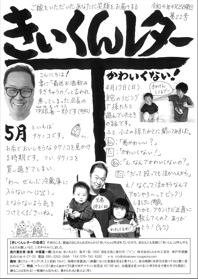 2022/05/01 5月のきいくんレター🎏 販促物 こんにちは!しらかわ工芸社です 今月も、会長が発刊しているきいくんレターをお届けします♪ 今回はお孫さんとの会話の一場面、 小学二年生のたかとくんはやんちゃ盛りのようですね!(⌒∇⌒) 桜も散って、新緑の季節となりました。 夏の訪れの気配を感じて心がワクワクしてきますね♪ 朝晩とお昼の温度差が大きいので、お体に気を付けてお過ごしください。