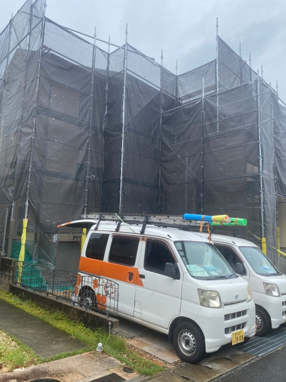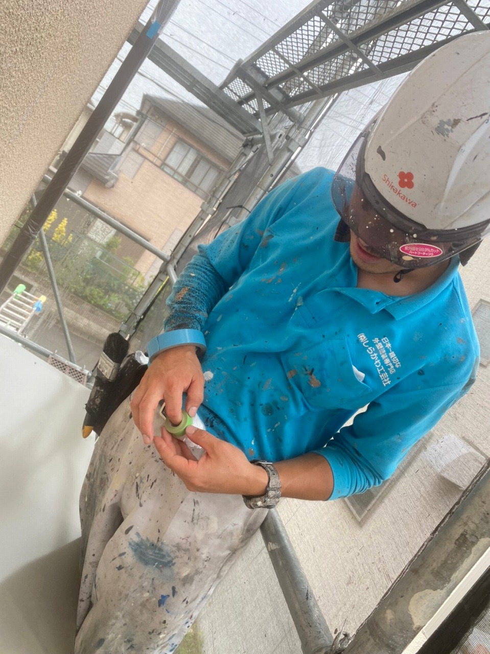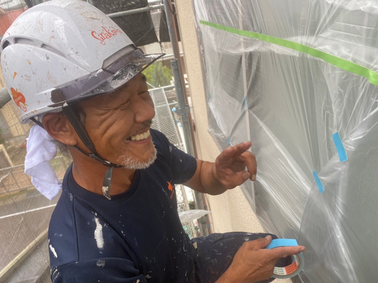雨で養生したい物が濡れているのでテープが付かないところがあるみたい!苦戦している玉井さん!
