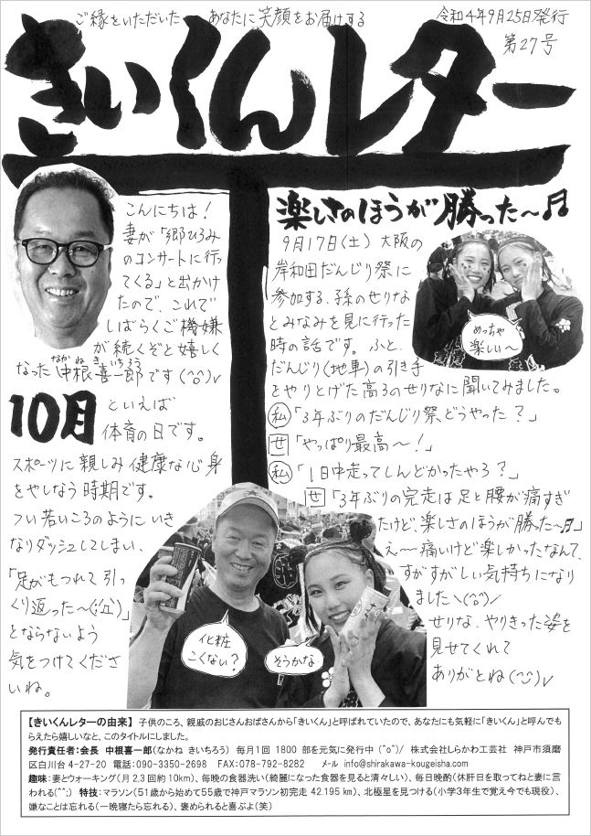 空気はひんやりしていますが、心はほっこり温かく、今月もきいくんレターが発行しました!