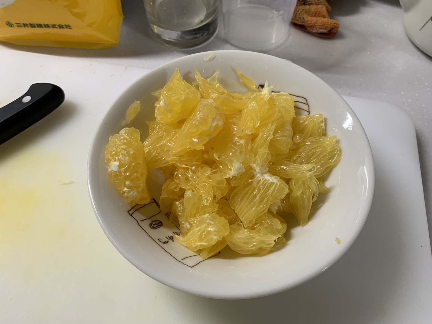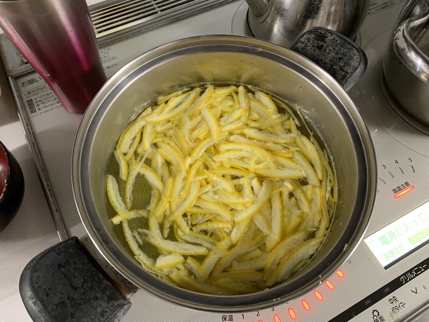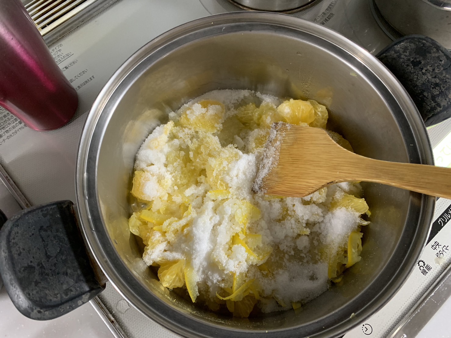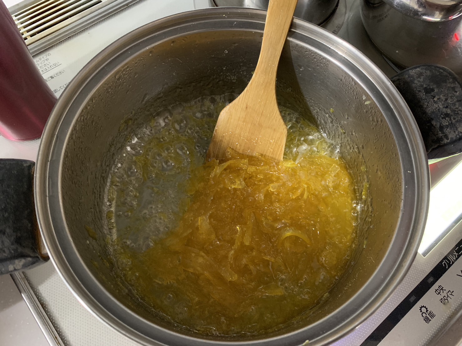 皮を小さくに刻んで、実と一緒にグラニュー糖で煮詰める。