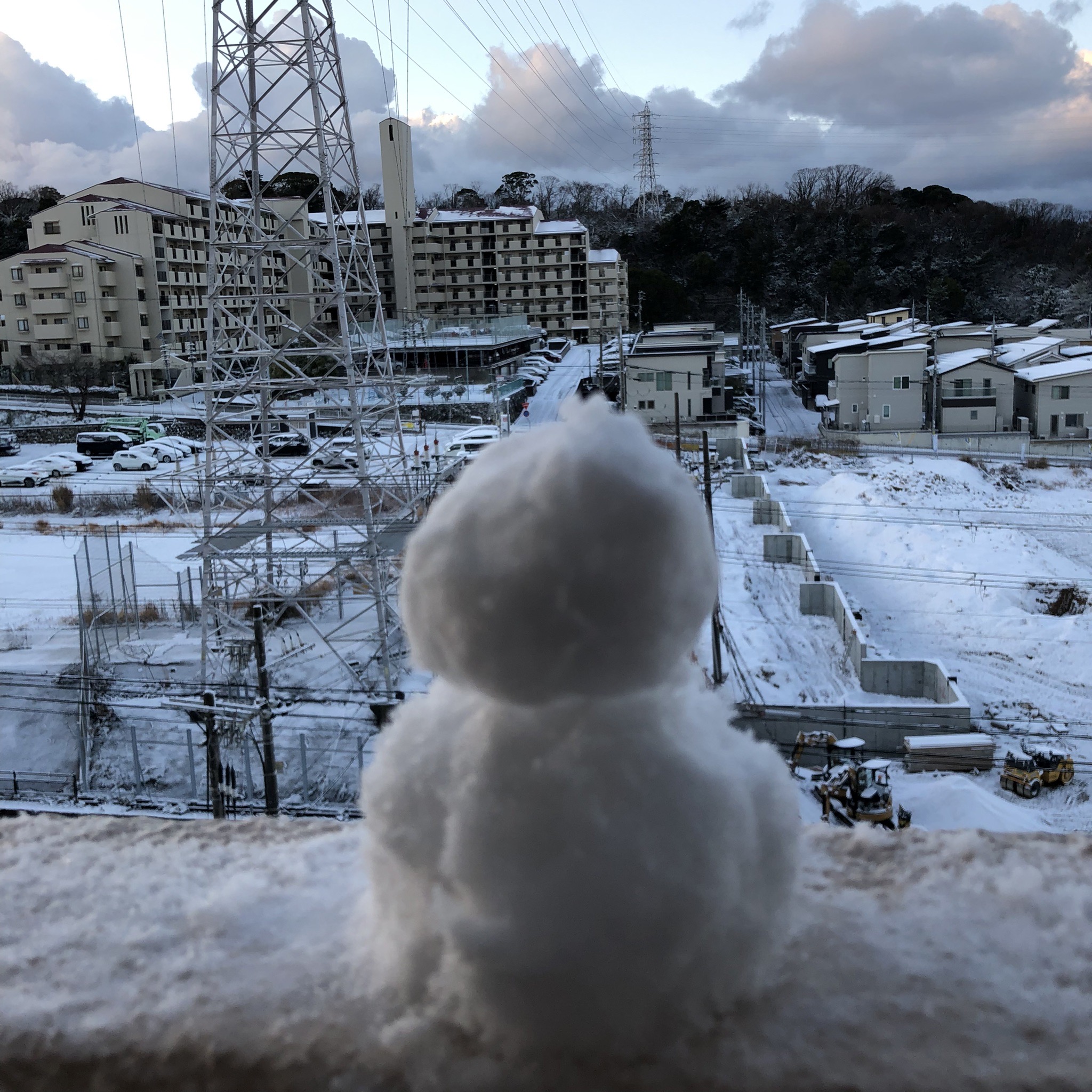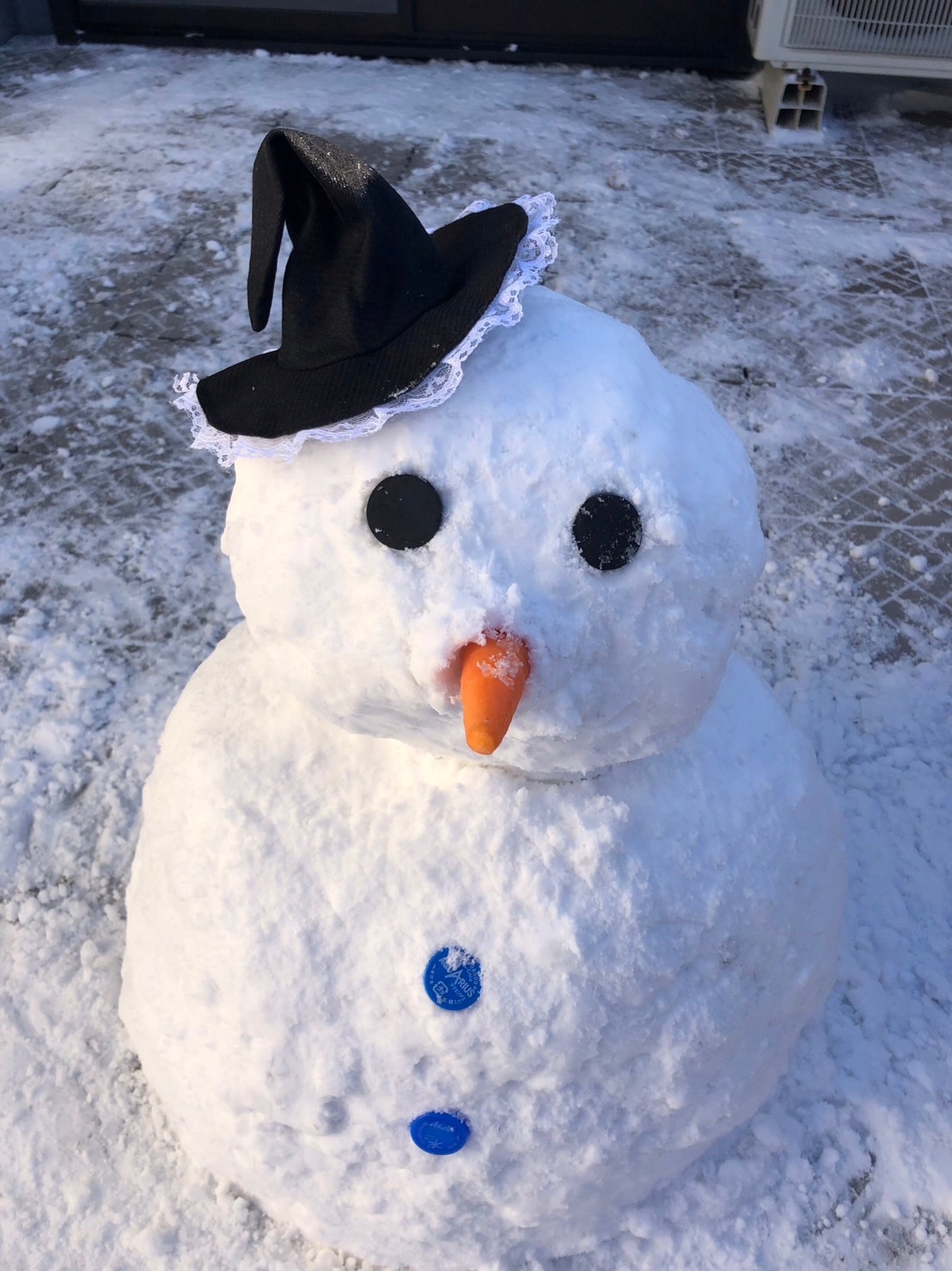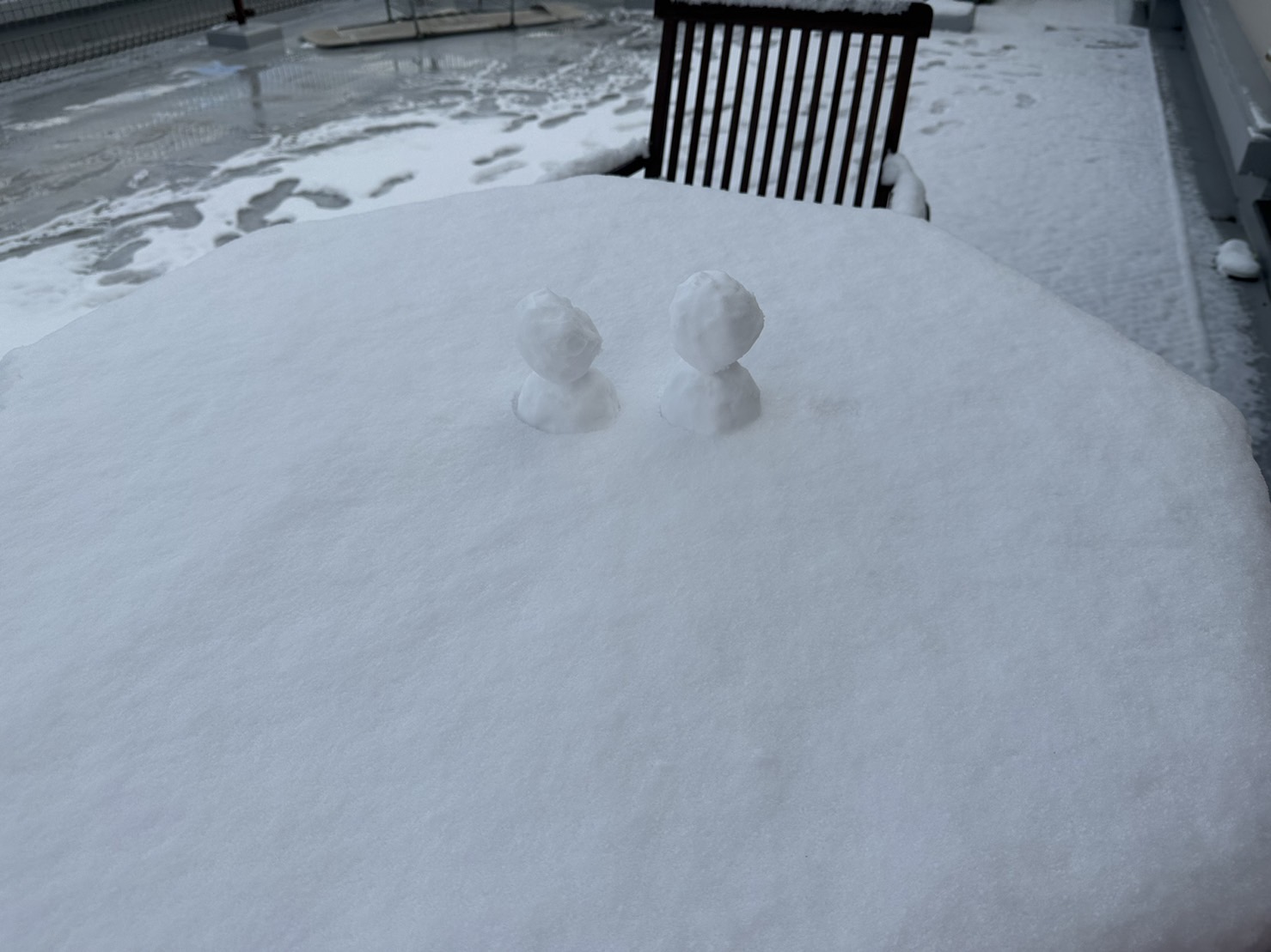 私のお家もバルコニーが真っ白!思わず雪だるまを作りました~。