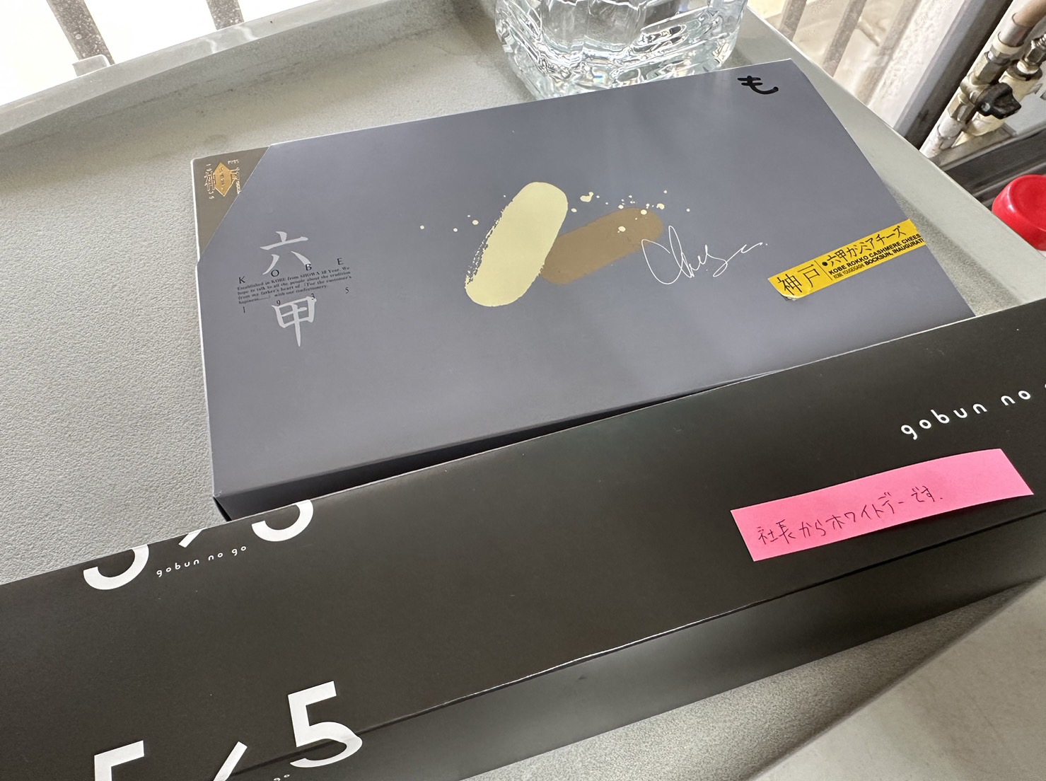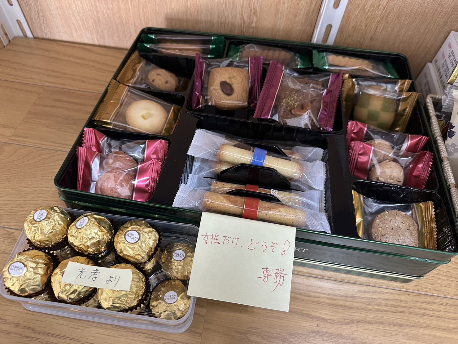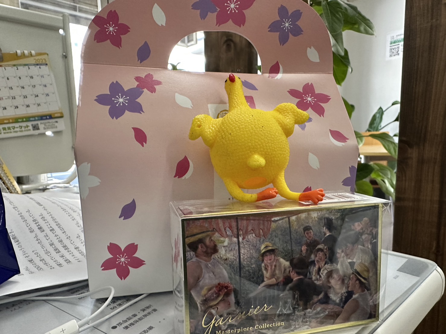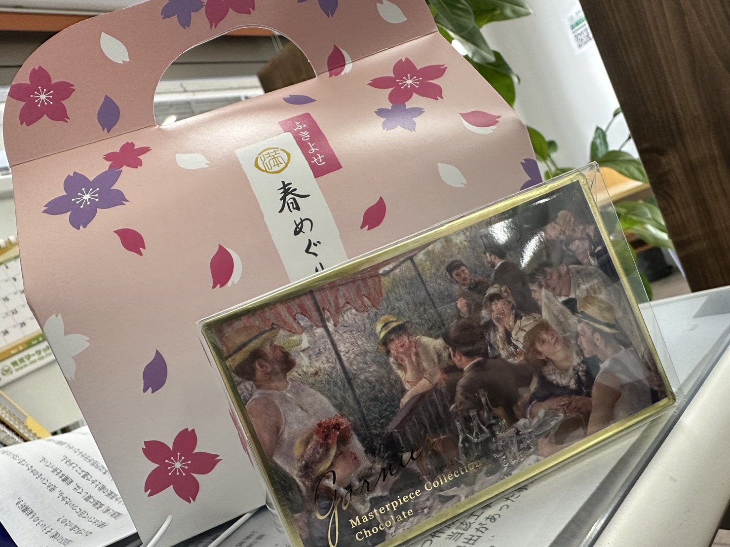 かわいい春っぽい箱に入ったおかきは裕太さんから。絵画が描かれたおしゃれな箱は濱上さんから。