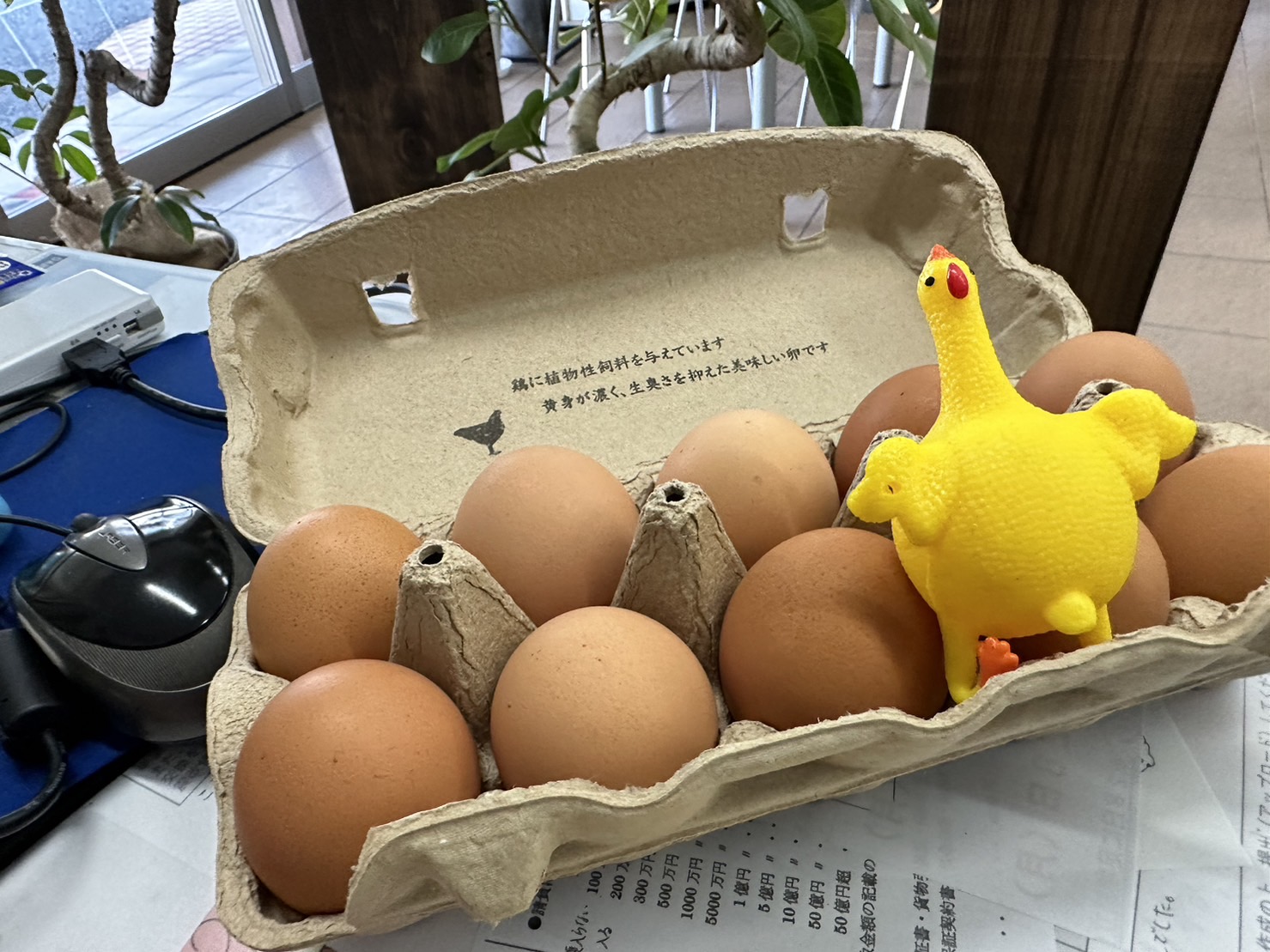 そして「私が産んだのよ~」と言わんばかりに玉子を守るおもちゃのニワトリは玉井さんから🐓