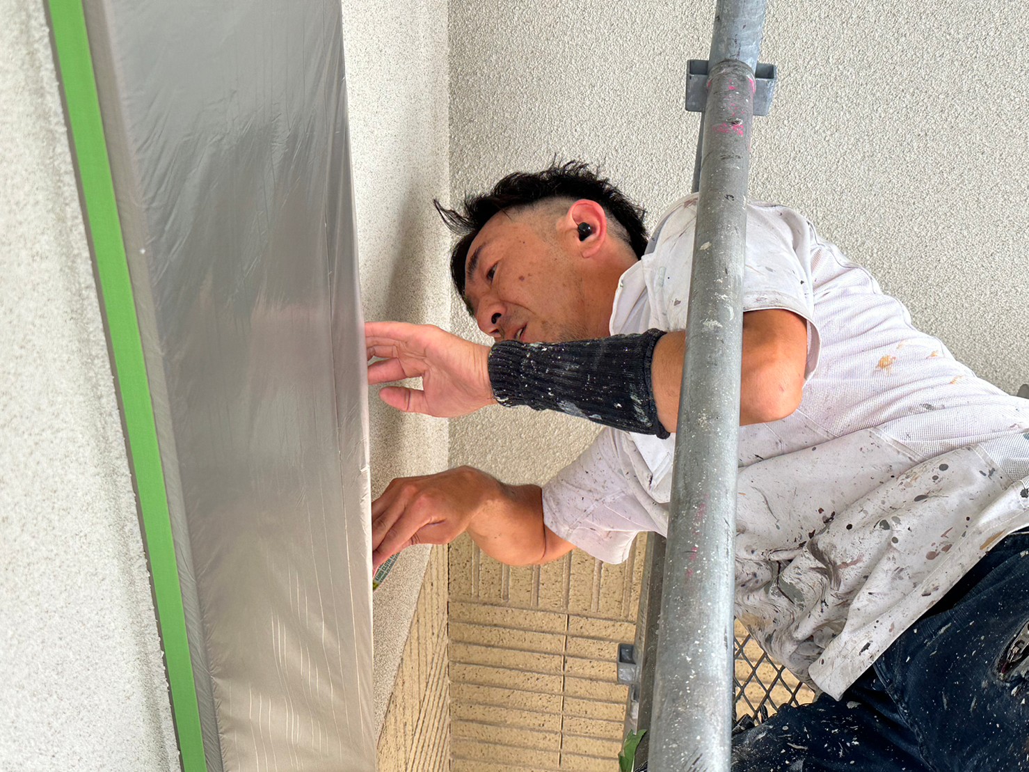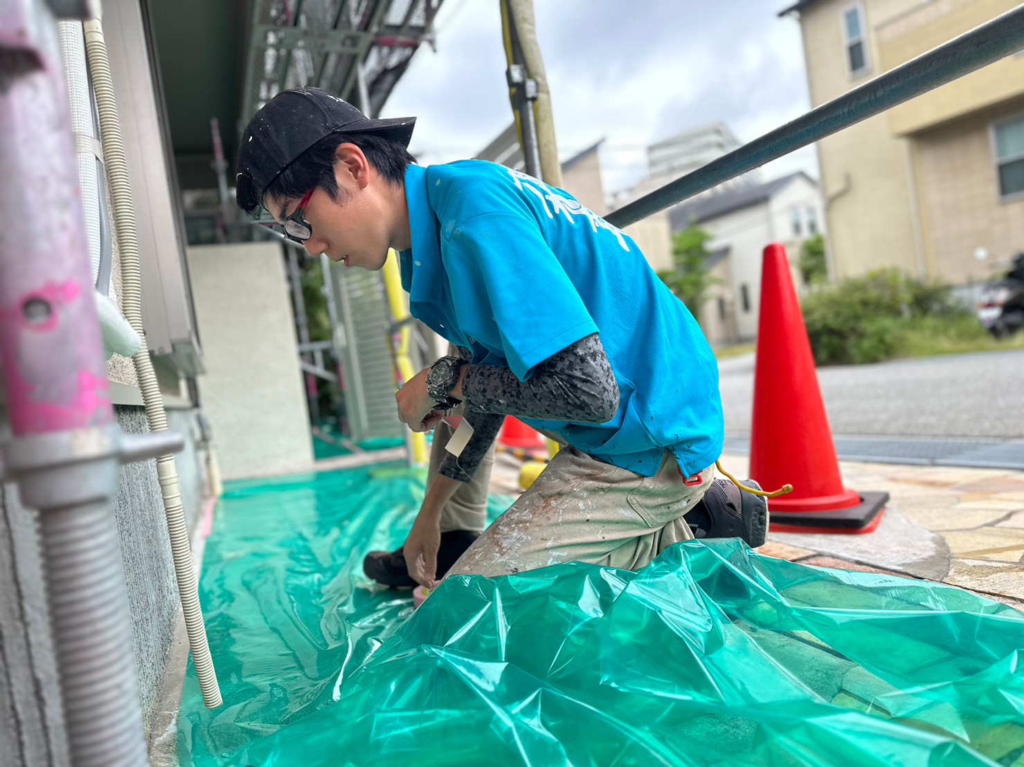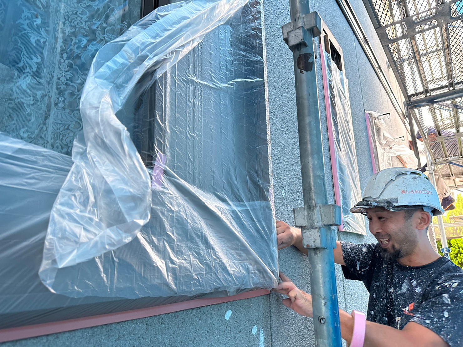 太田さんは素敵な笑顔で玄関廻りの養生、福田さんもかわいい笑顔で窓の養生をしていました(≧▽≦)