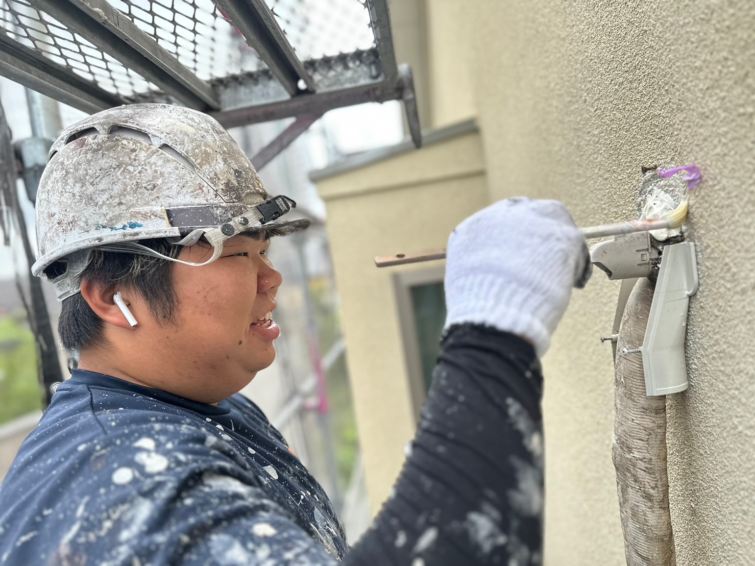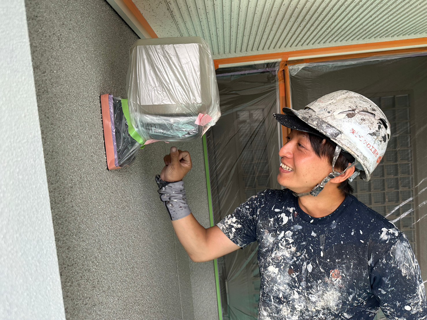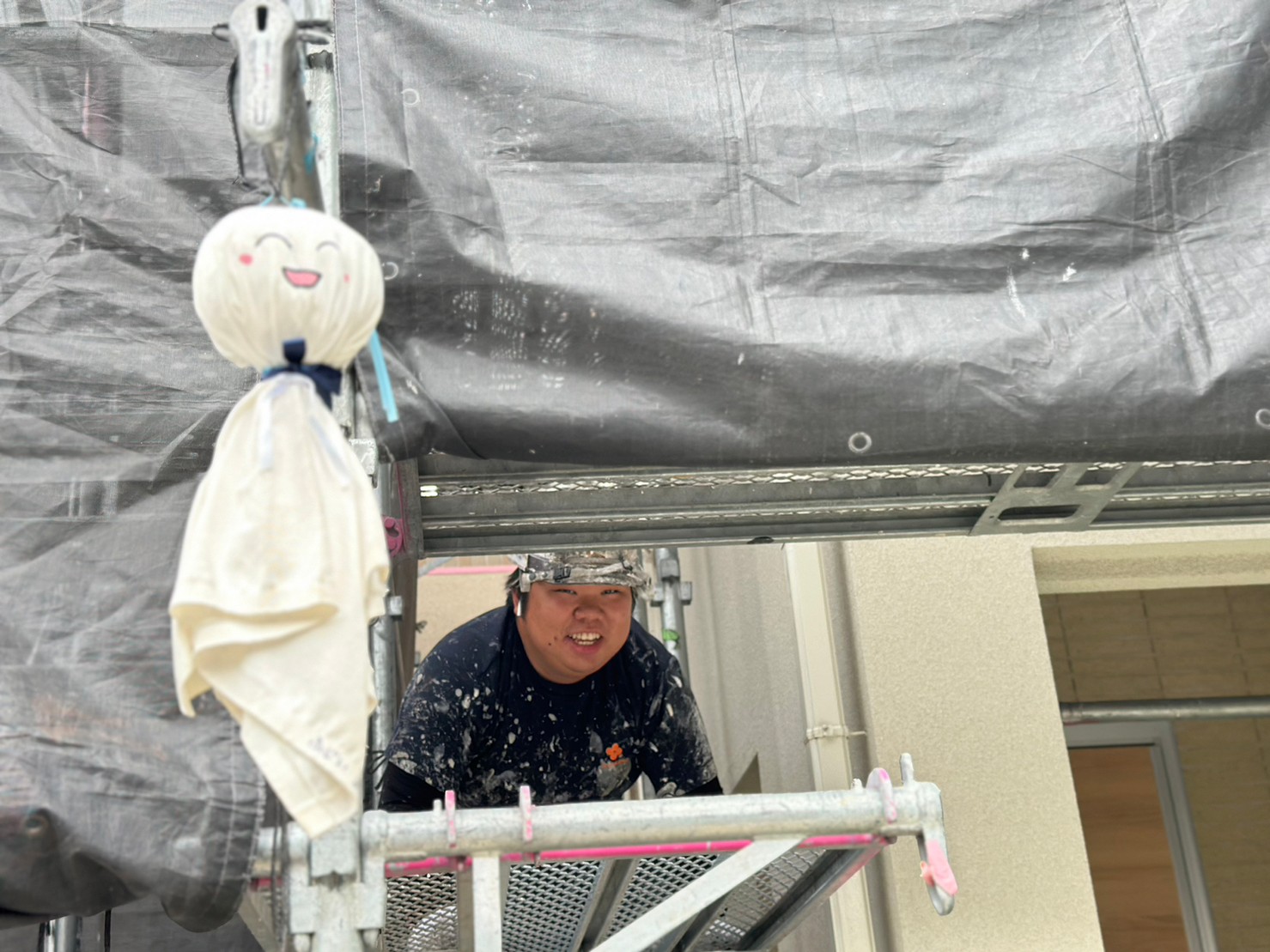 太田さんは素敵な笑顔で玄関廻りの養生、福田さんもかわいい笑顔で窓の養生をしていました(≧▽≦)