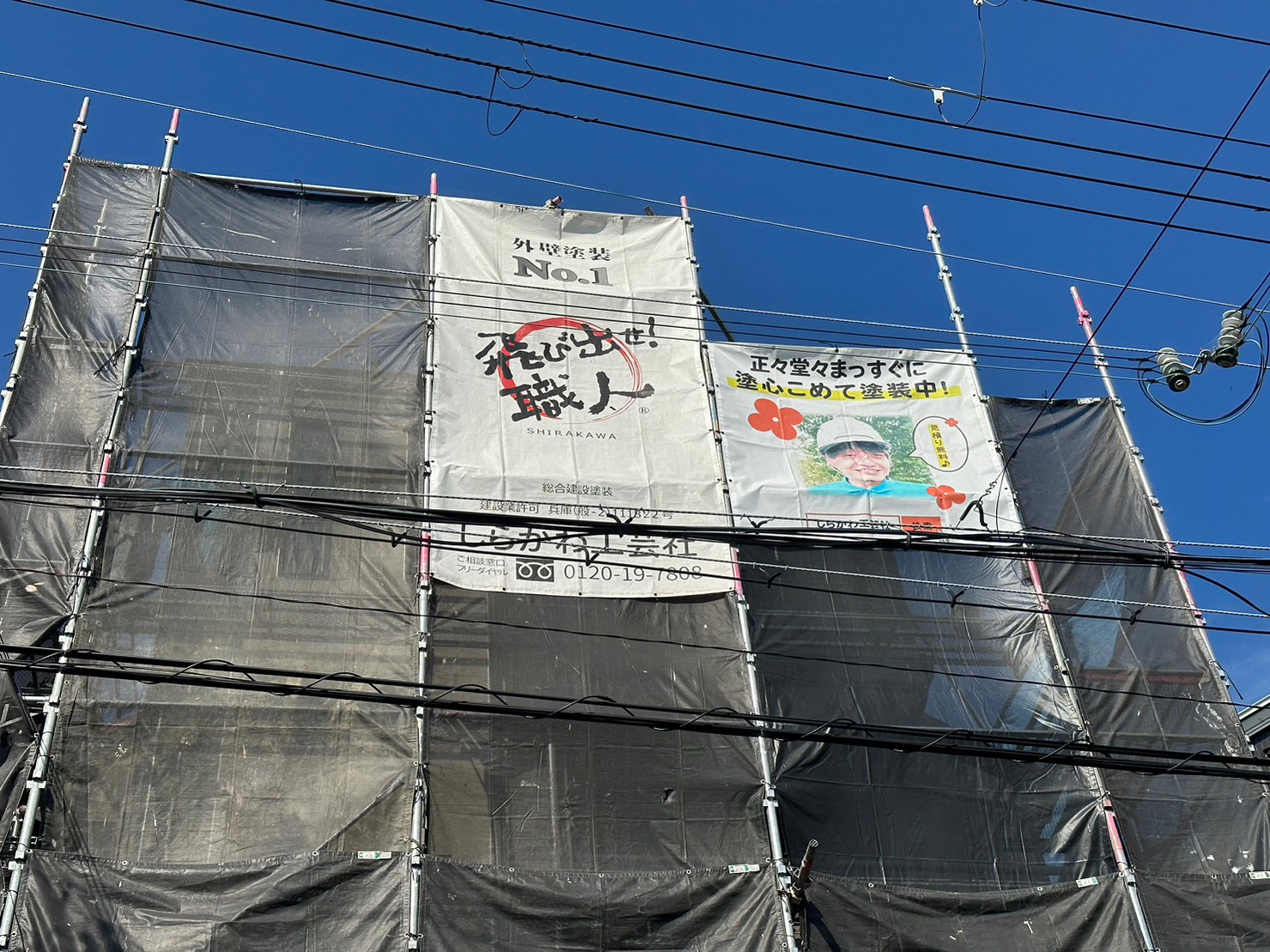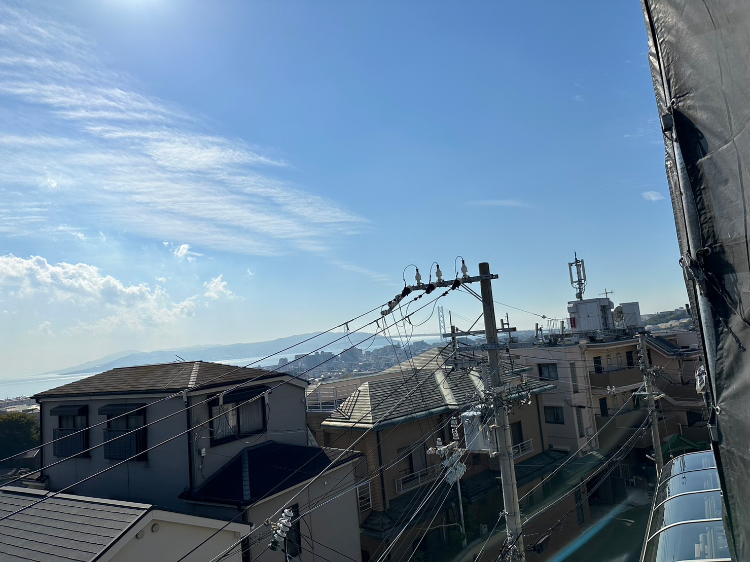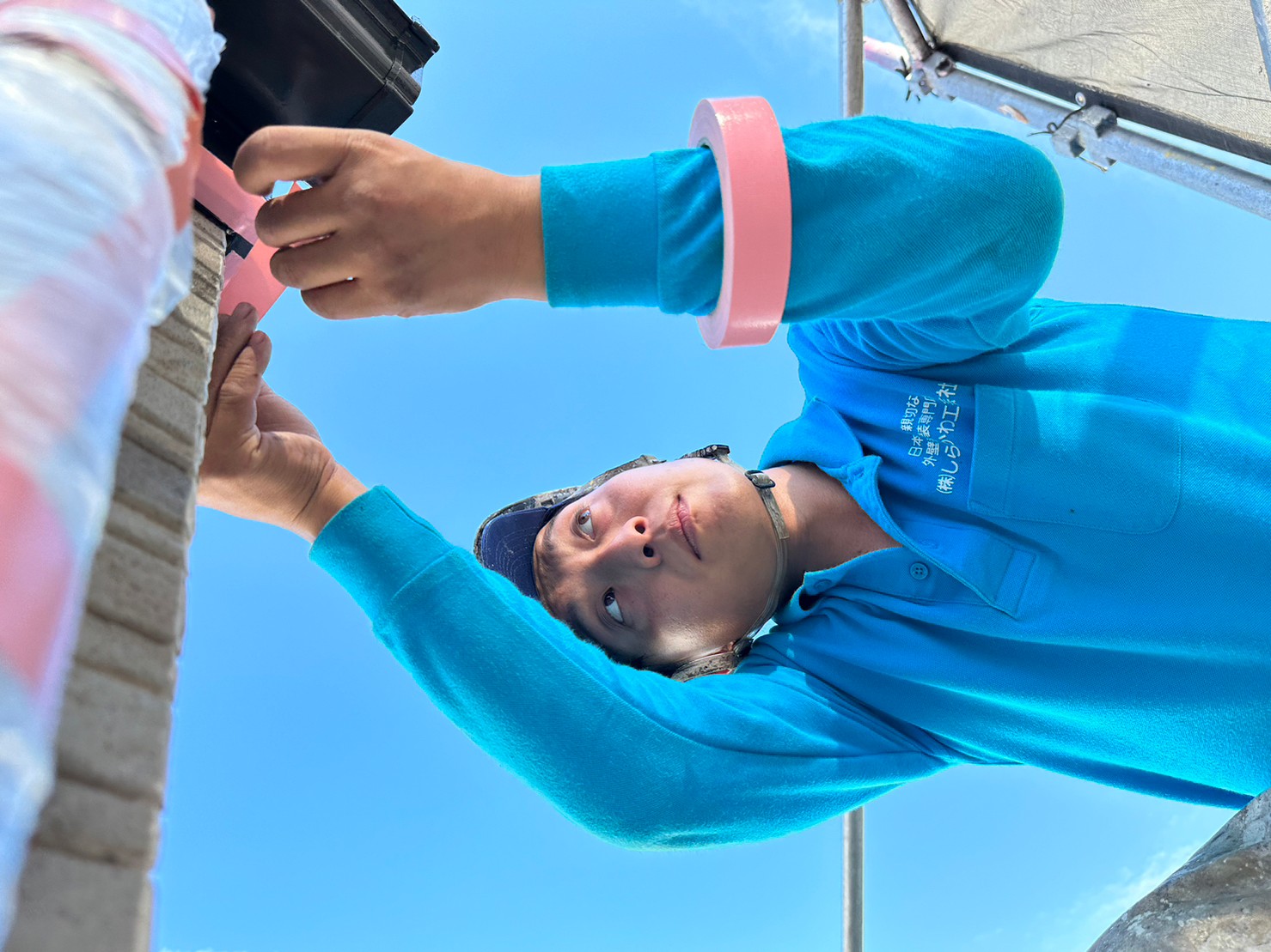 高台にある建物なので足場の上、特に屋根の上はめっちゃ高い!?ちょっとへっぴり腰の太田さん!