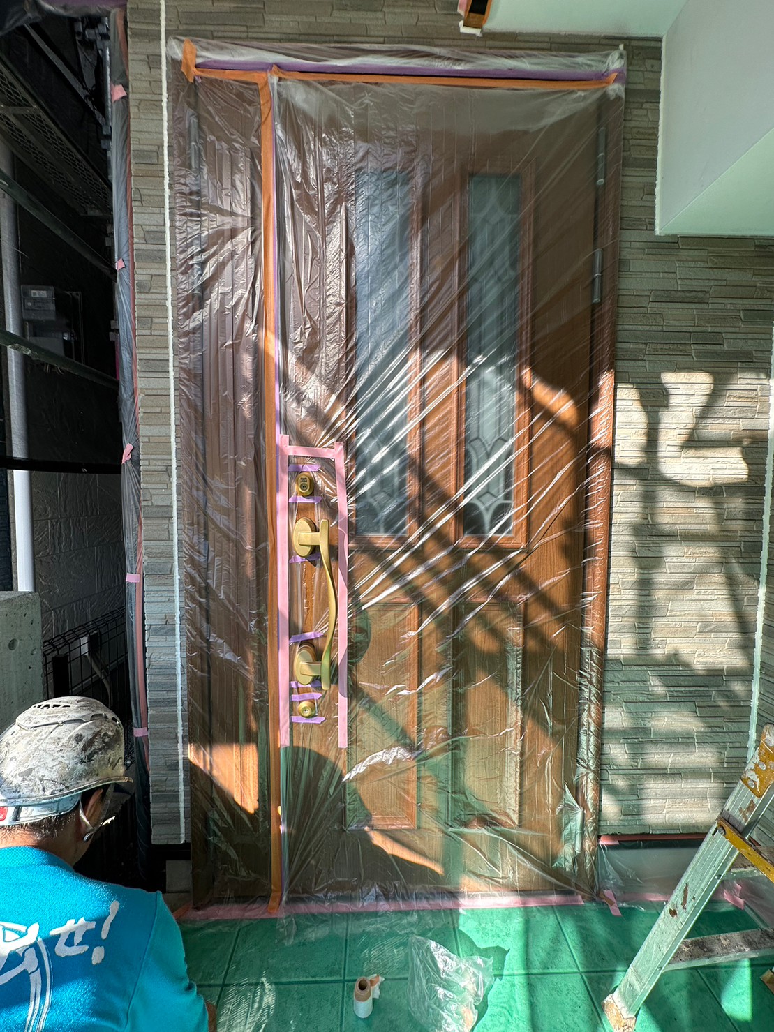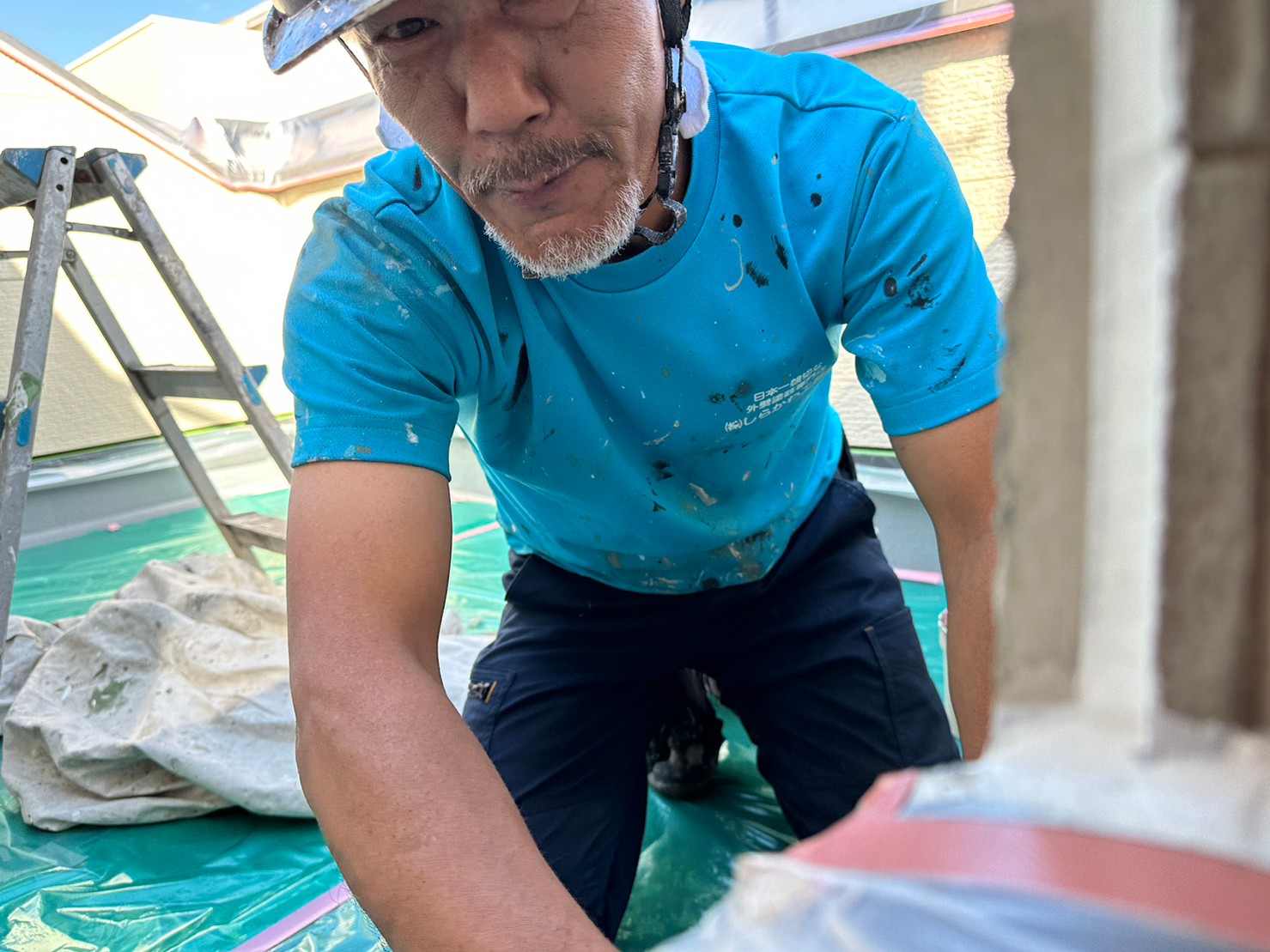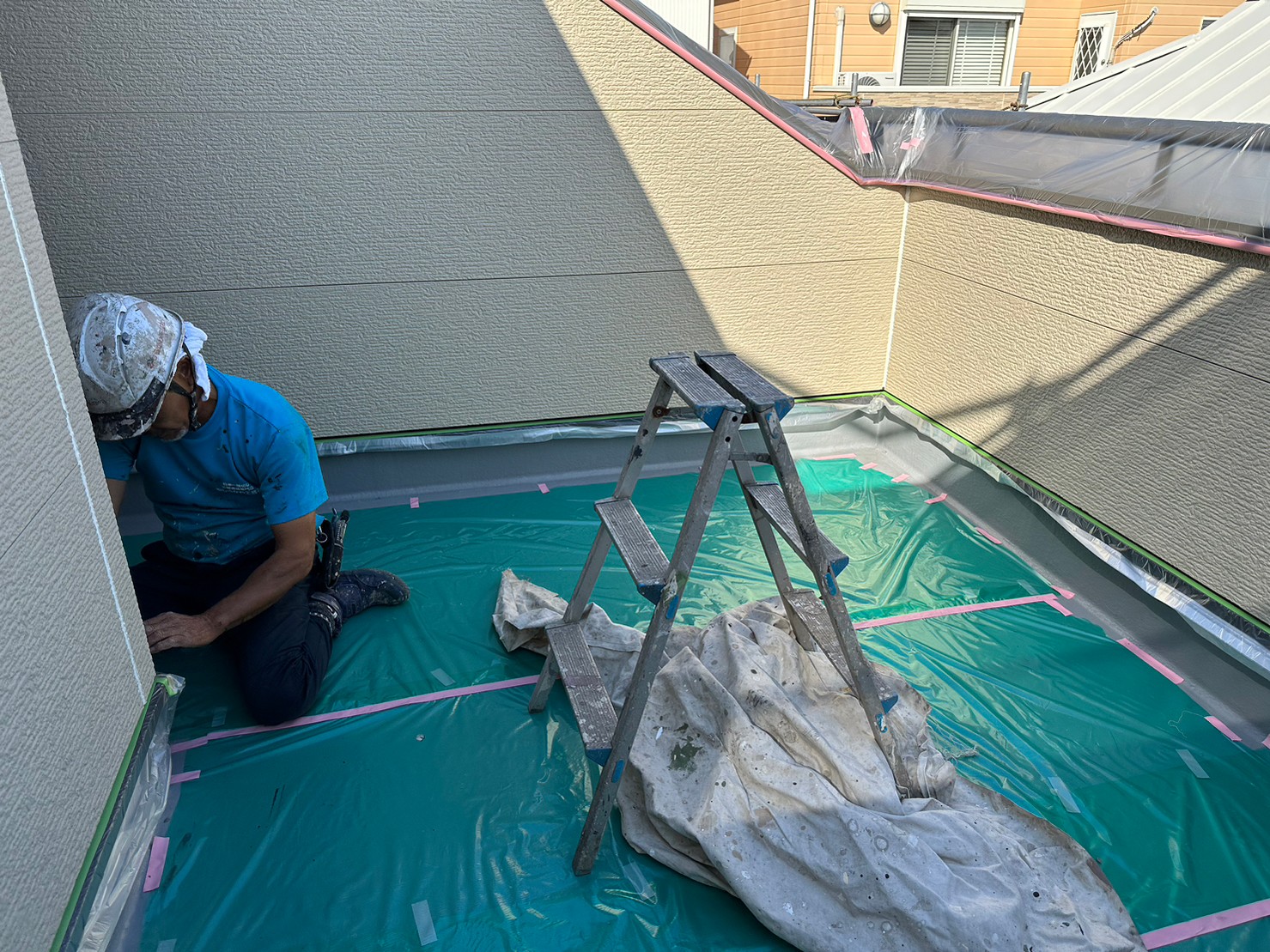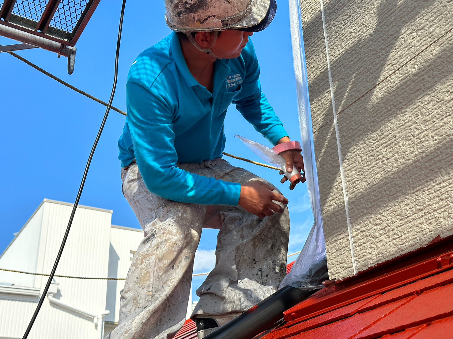 高台にある建物なので足場の上、特に屋根の上はめっちゃ高い!?ちょっとへっぴり腰の太田さん!