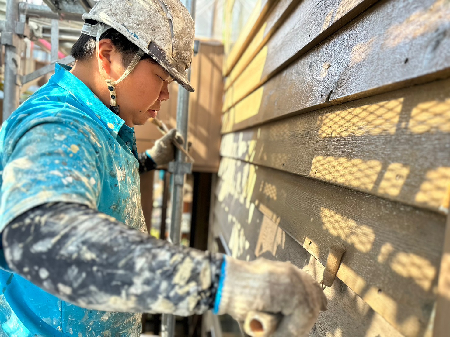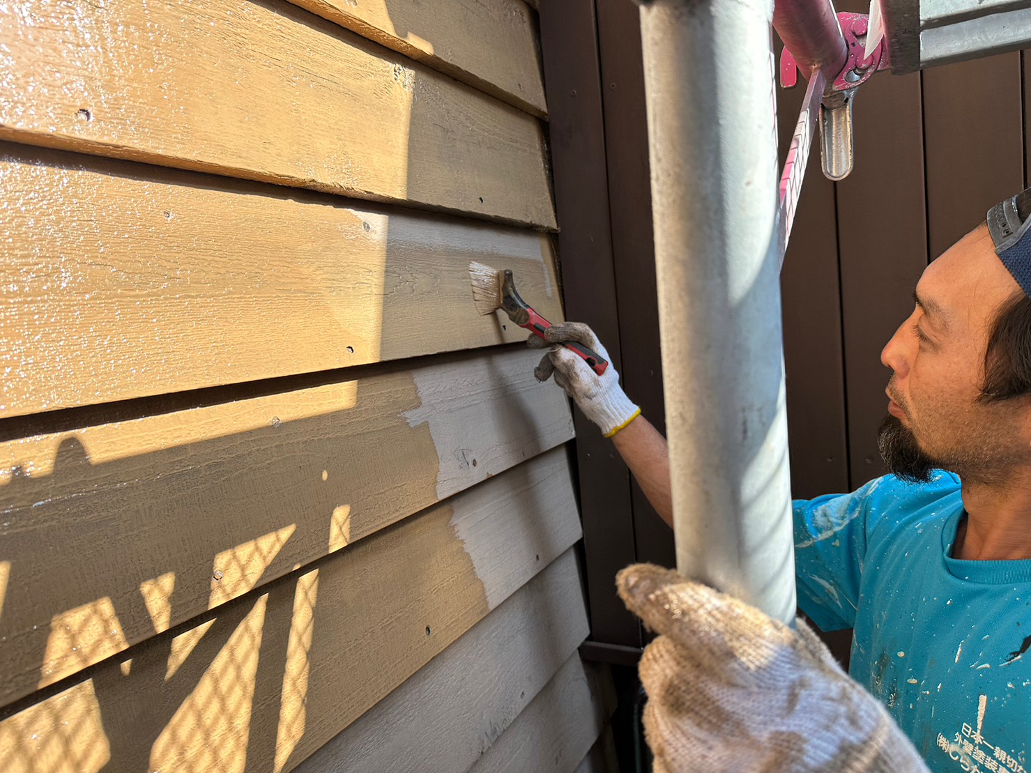 ここの現場は、外壁の材質がモルタルやサイディングなどとは違って木部で出来た外壁です♪