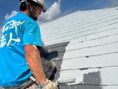 こんにちは! 今週は外壁と屋根に色を付けている現場がたくさんありました(^^)/ 神戸市須磨区友が丘では屋根中塗り♪ グレーから白にほのかにグレーが入っている色に変化中♪ 遮熱塗料のため濃い色よりかは…