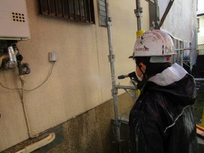 汚れが残ったまま塗装してしまうと、塗料の密着性が悪くなり耐久性も悪くなるおそれがあるので、汚れやチョーキングをきれいに洗い流していきます。