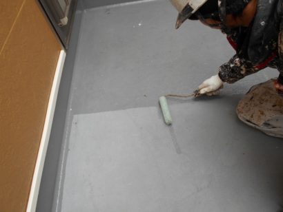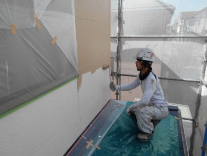 外壁と屋根は3回塗りをします。 まずは下塗りです。 下塗りは次に塗る塗料との接着剤の役目があるので、しっかりと塗っていきます。