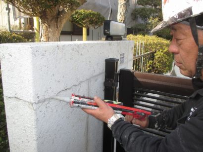 ひび割れ箇所に接着剤の役目を果たすプライマーを塗布し、そのあとに写真にあるコーキング剤を注入します。