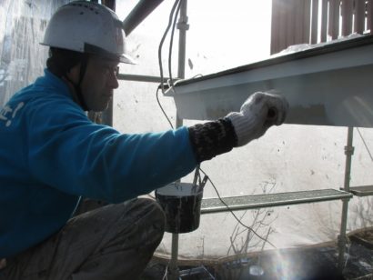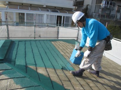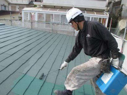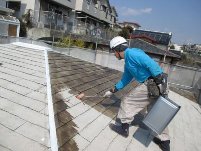 屋根も外壁と同様に3回塗りをします。 しっかりと下塗り剤を塗って、塗料の密着性を高めます。