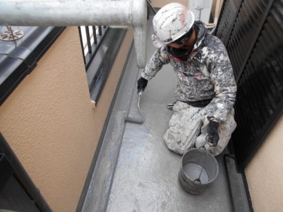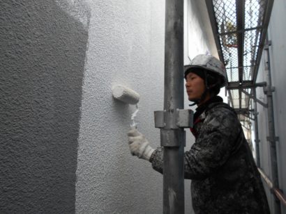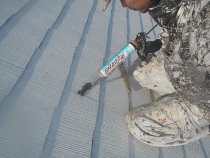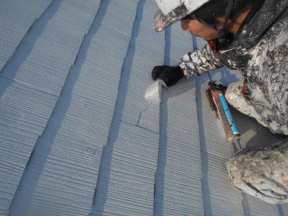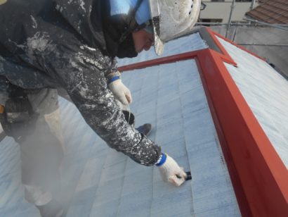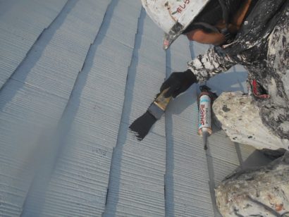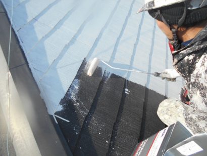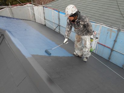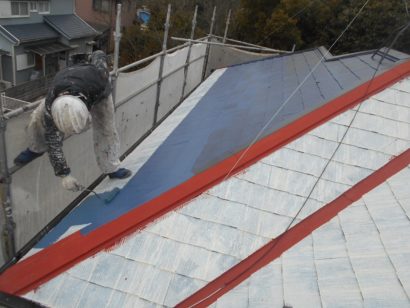 屋根の下塗りをしています。 下塗りは外壁と同様、接着剤の役目があるで しっかり塗っていきます。