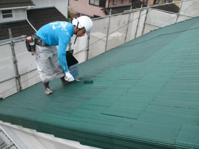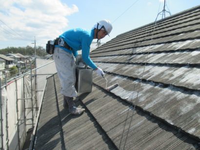 屋根も外壁と同様に3回塗っていきます。 まずは下塗りです。