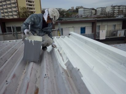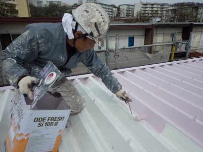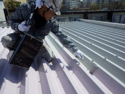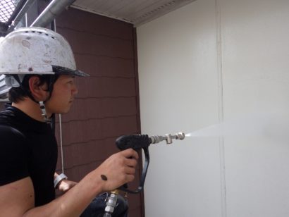 屋根も外壁と同様に 高圧洗浄をします。 汚れや葉っぱなどを落としてます。 そして下塗りを行います。