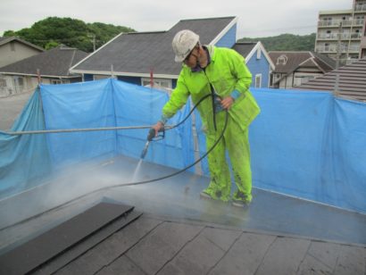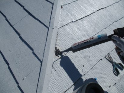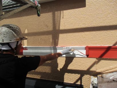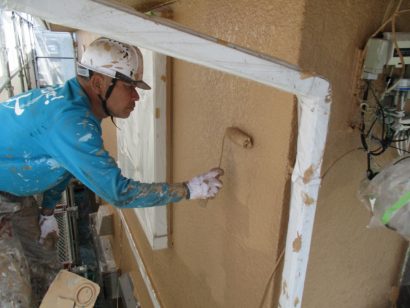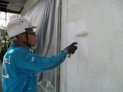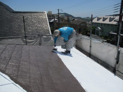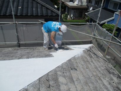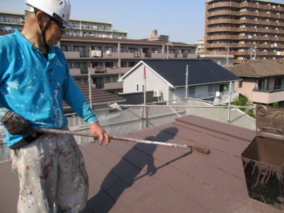 下塗りをしていきます。 屋根の上は滑りやすいので、 慎重に作業していきます。