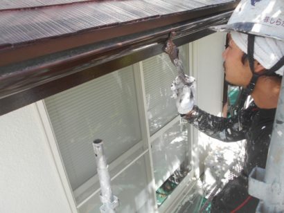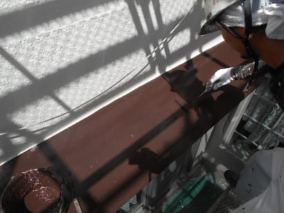 破風板の下塗りをしています。