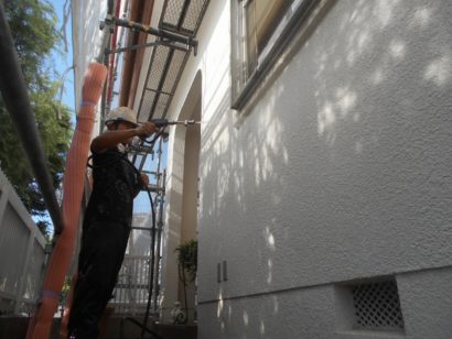 高圧洗浄をしてから下塗りをします。 下塗り後に先ほど述べたタスペーサーを 挿入します。