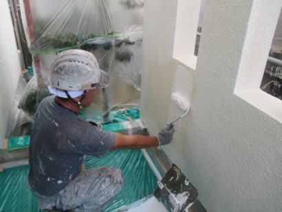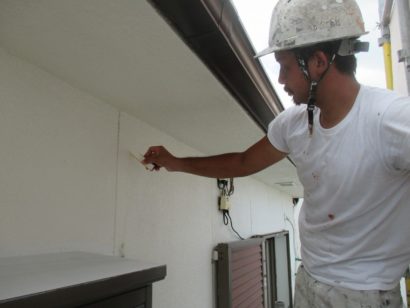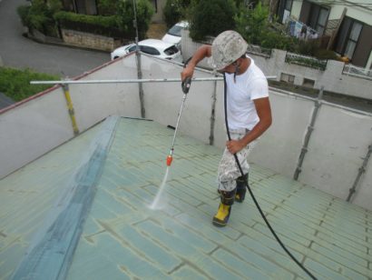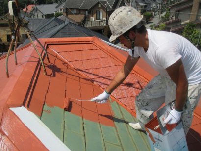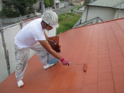 屋根の下塗りをしています。 密着性を高めるため、しっかりと塗っていきます。