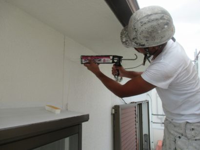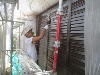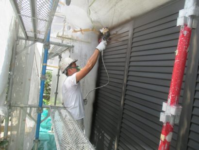 吹き付け塗装は塗料の飛散が激しいので、特にしっかりと養生をしてから行います。