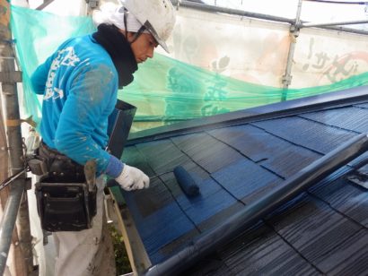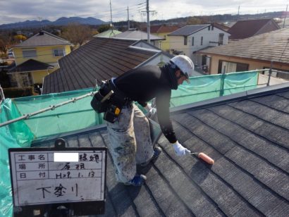 屋根は3回塗りをしていきます。 まずは下塗りです。 下塗りは、次に塗る塗料との接着剤の役目があるので しっかり塗っていきます。