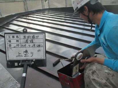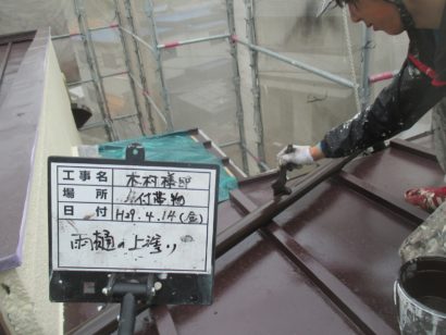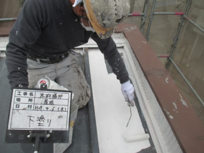屋根の下塗りです。 外壁同様しっかりと塗ります。