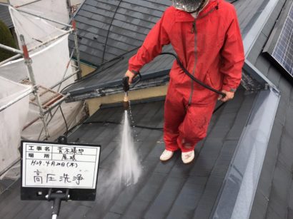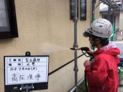足場組みが終わると、まずは高圧洗浄から始めます。