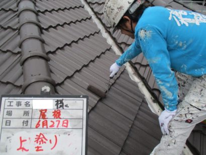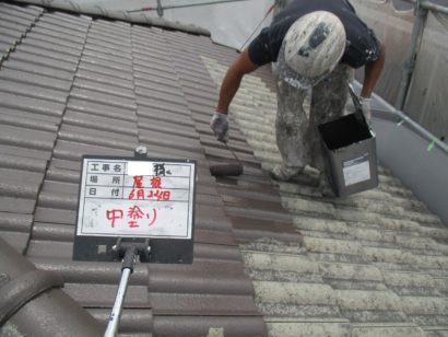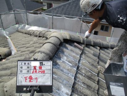 屋根は基本3回塗りします。 まずは下塗りです。 下塗りは次の塗料との接着剤となる役目があるため たっぷりと塗っていきます。
