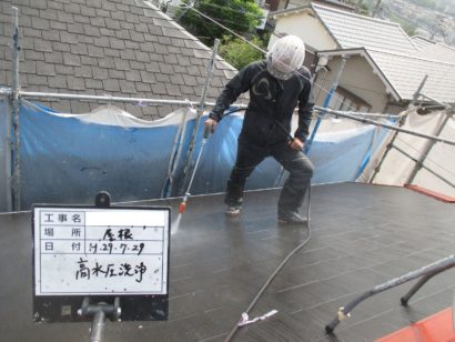 屋根も高圧洗浄を始めにします。