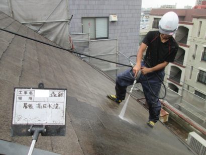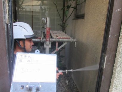 塗膜の粉状、コケなどを勢いよく洗い落とし