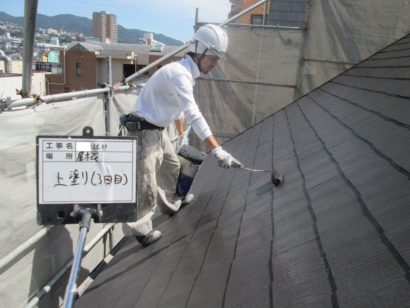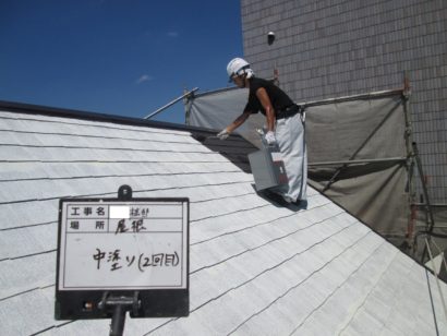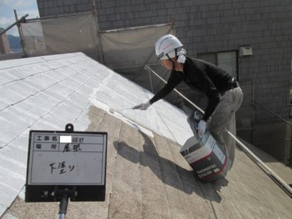 次は屋根塗装のようすを紹介します。 屋根も外壁同様、基本3回塗りです。 まず1回目の下塗りです。