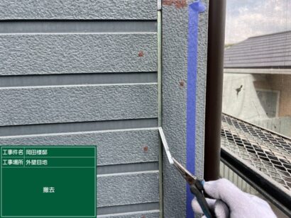 目地のシーリングが劣化しているとそこから雨水が浸入し、カビやサビが発生したりボードが反り返ったりと、お家の寿命に大きくかかわります。そこで傷んだ元のシーリング材を撤去し、新しく打ち替える作業をしていきます。まず、古い目地を撤去します。