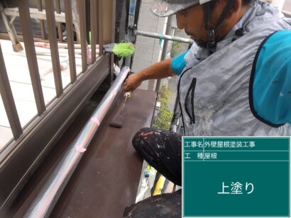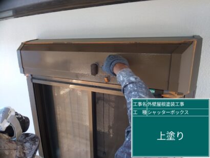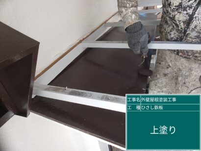 上塗りで仕上げます。屋根や新しい外壁の色に合って、きれいになりました!