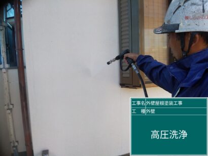 外壁を丁寧に高圧洗浄して汚れを落としていきます。