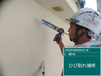 外壁にひび割れしている箇所があったので、コーキング剤を注入して補修します。