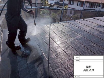 屋根も外壁と同様、高圧洗浄できれいにしていきます。水が飛散するので、周囲にも気を配りながら作業します。