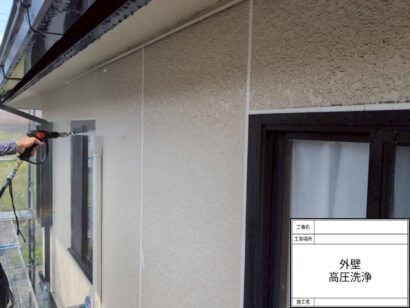 外壁を丁寧に高圧洗浄して汚れを落としていきます。
