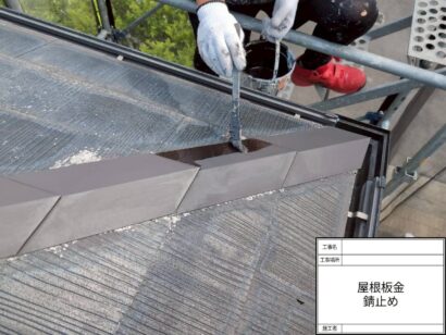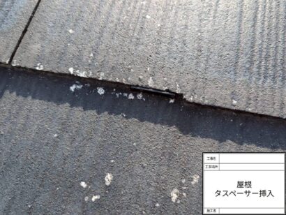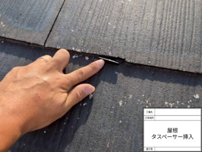 屋根にタスペーサーを挿入しているところです。塗料が瓦の継ぎ目につまって通気性が確保できなくなるのを防ぎます。