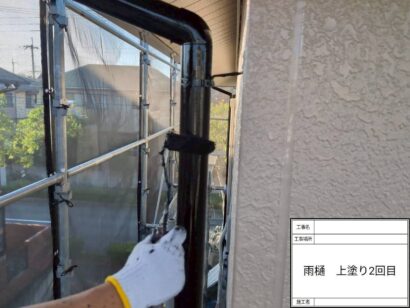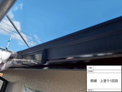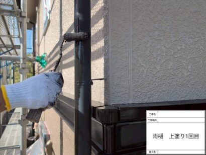 雨といは横雨といと縦雨といがあり、塩化ビニール素材が多く基本2回塗りをします。しっかり目粗ししてから塗装していきます。