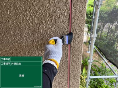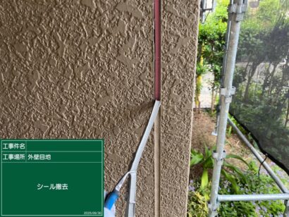 目地のシーリングが劣化しているとそこから雨水が浸入し、カビやサビが発生したりボードが反り返ったりと、お家の寿命に大きくかかわります。そこで傷んだ元のシーリング材を撤去し、新しく打ち替える作業をしていきます。まず、古い目地を撤去します。